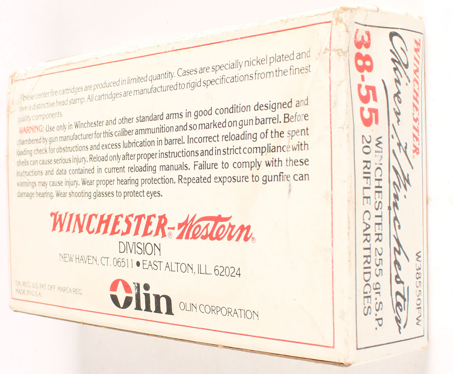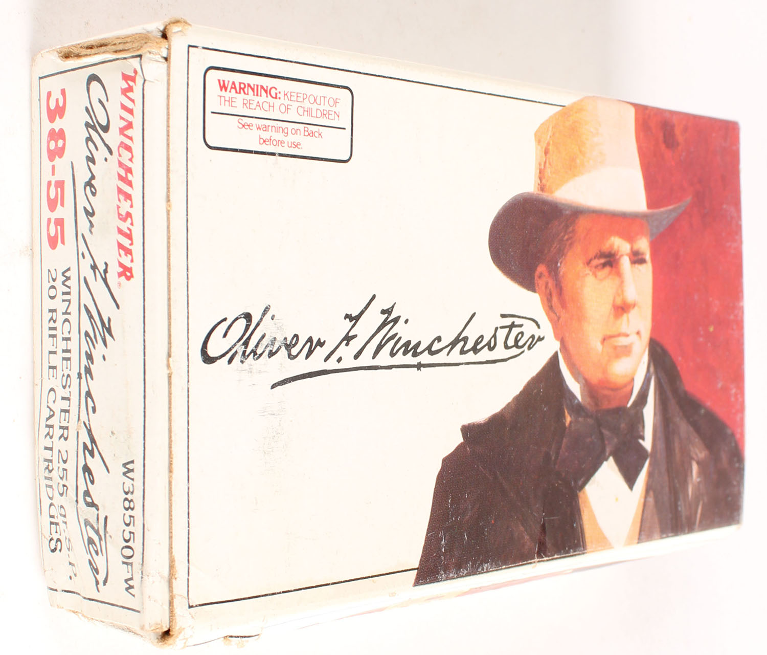 Winchester, Oliver F. Winchester, .38-55 Winchester, 255 Grain Soft Point, Full, 1pc. White box picturing Oliver Winchester, box is solid with excellent color, corner ding on front left corner, front is creased, minor shelf wear, some corner wear, edges are mostly crisp, end flaps are solid, ammo is excellent. Grade: Very Good ++ - Value: 20 to 80
