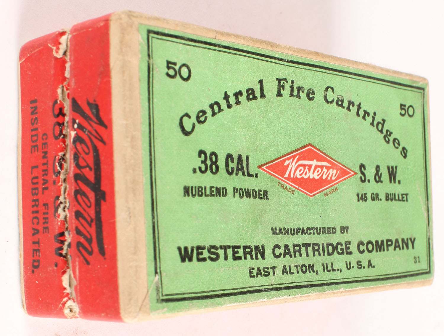 Western, Central Fire Cartridges, .38 Smith & Wesson, Nublend Powder, 145 Gr. Bullet, Full, 2pc. Buff box with green top & red side sealing labels, box is solid with excellent color, corners are mostly sharp, edges are mostly crisp, labels are intact, ammo is excellent. Grade: Excellent ++ - Value: 60 to 180