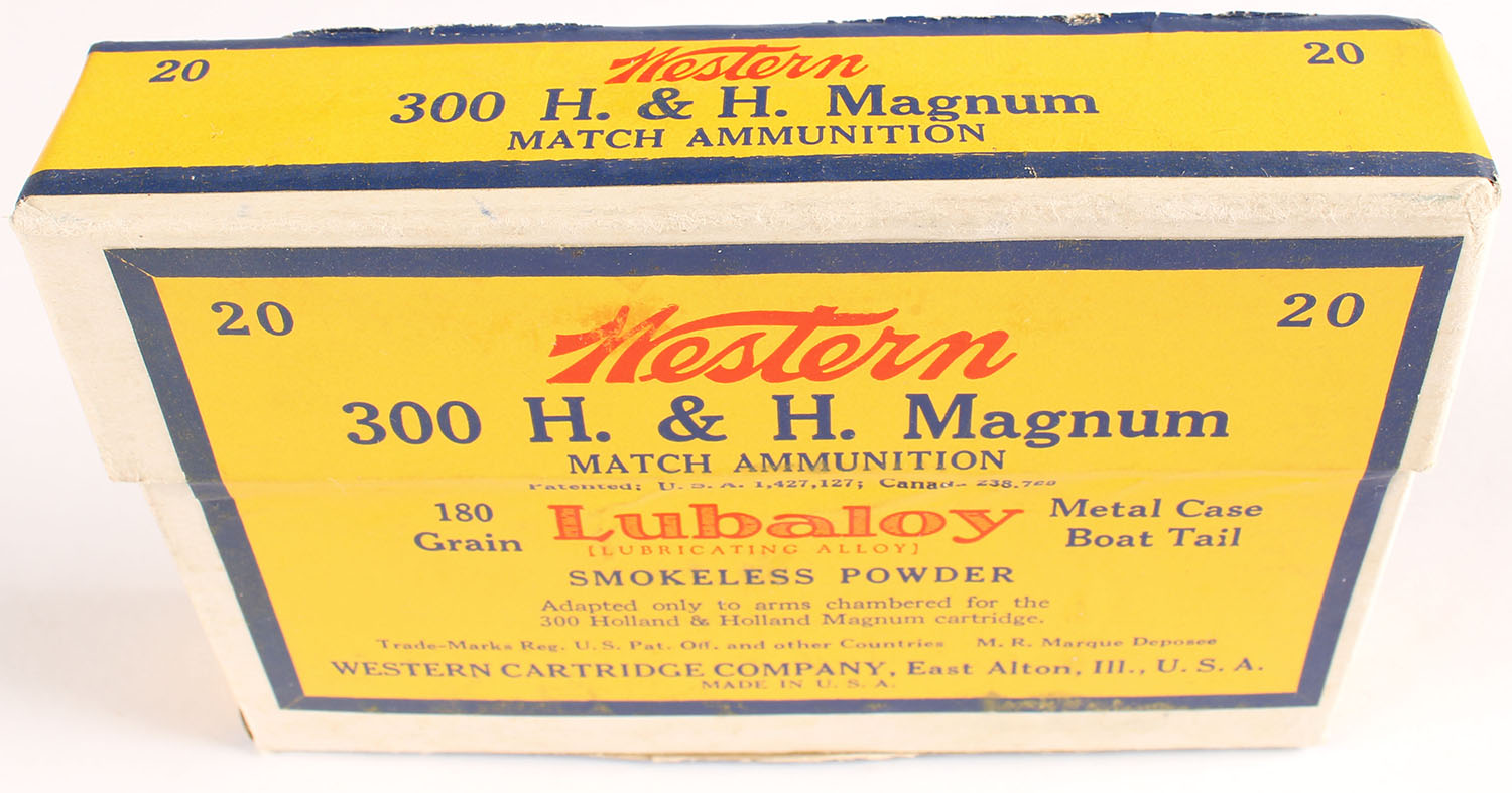 Western, Match Ammunition, .300 H&H Magnum, 180 Grain Metal Case Boat Tail, FULL & SEALED, 2pc. Buff box with yellow blue & red labels, box is solid with excellent to minty color, only very minor shelf & corner wear, edges are crisp, labels are intact. Grade: Excellent ++ - Value: 50 to 150