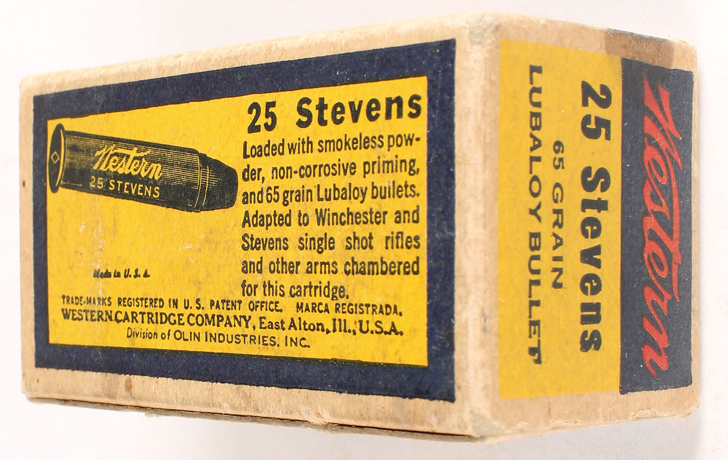 Western, Rim Fire Cartridges, .25 Stevens, 65 Grain Lubaloy Bullet, Smokeless Powder, Partial 25rds. 1pc. Blue yellow & red bull's eye box, box is solid with very good to excellent color, some age soiling, very minor edge & corner wear, front has been written on, end flaps are solid, ammo is excellent. Grade: Very Good ++ - Value: 30 to 90