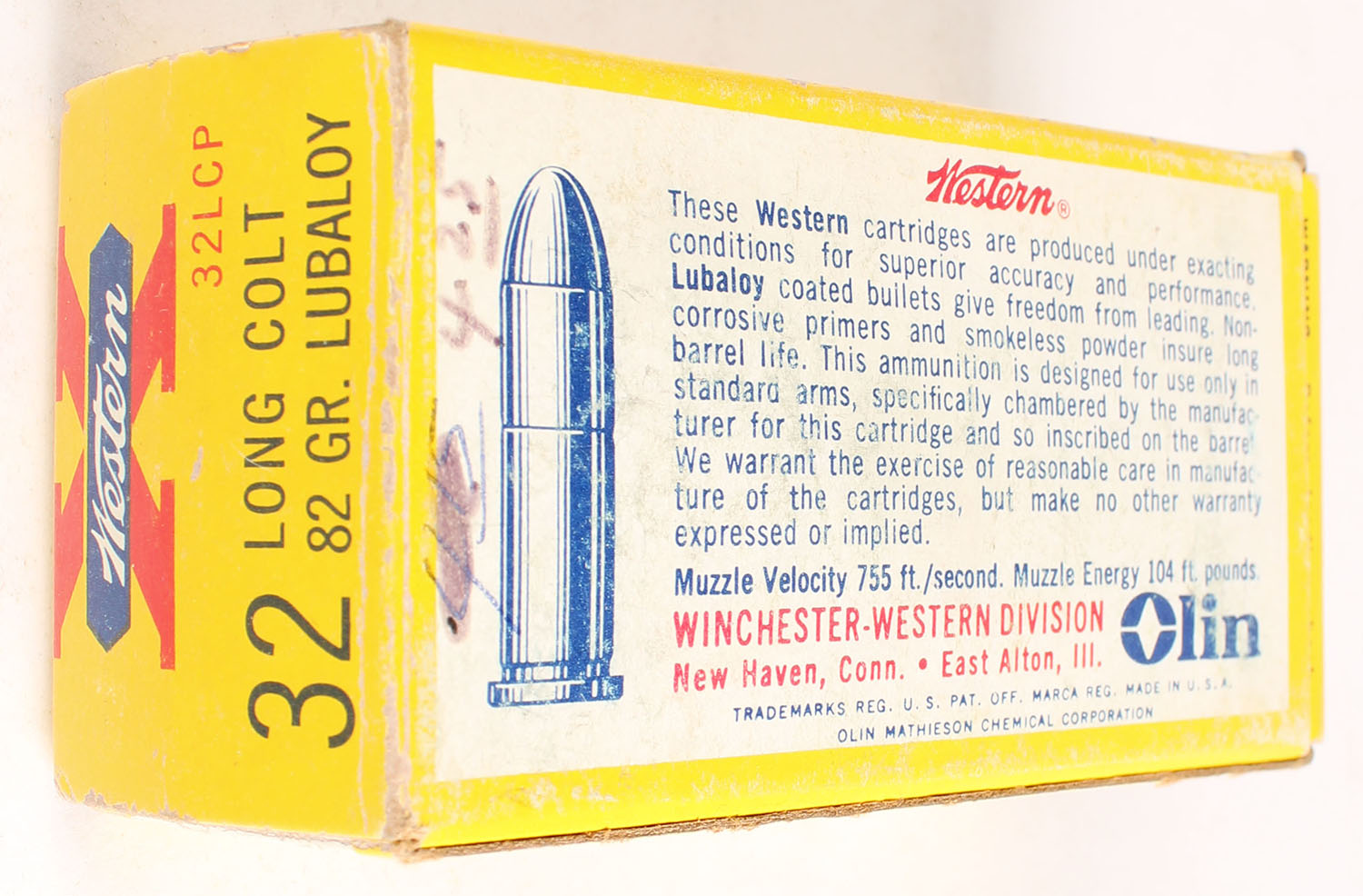 Western, X, .32 Long Colt, 82 Grain Lubaloy Bullet, Full, 1pc. Yellow white & red box, box is solid with excellent color, very minor shelf wear, top has been written on, minor edge & corner wear, end flaps are solid, ammo is excellent. Grade: Very Good ++ - Value: 30 to 90