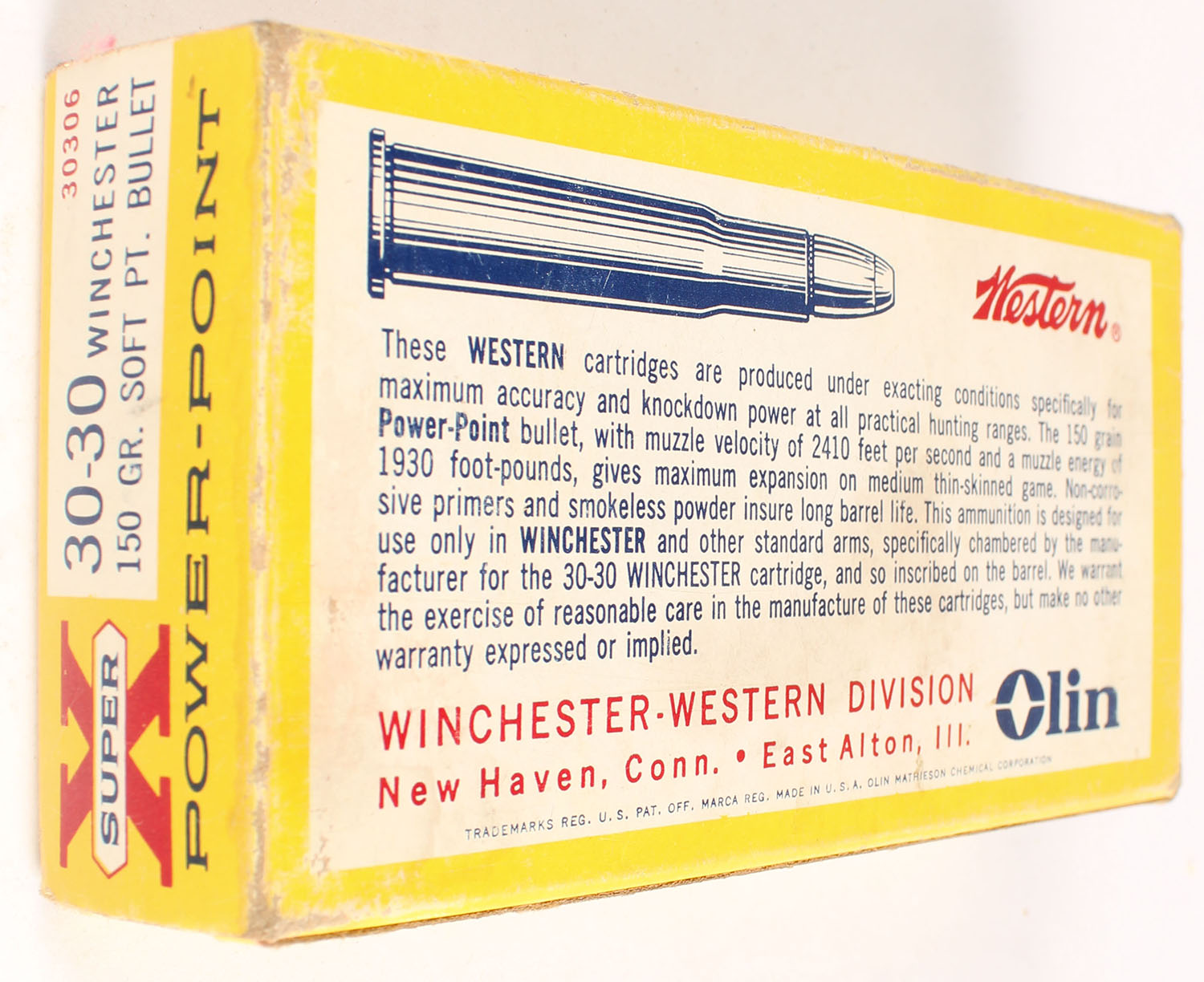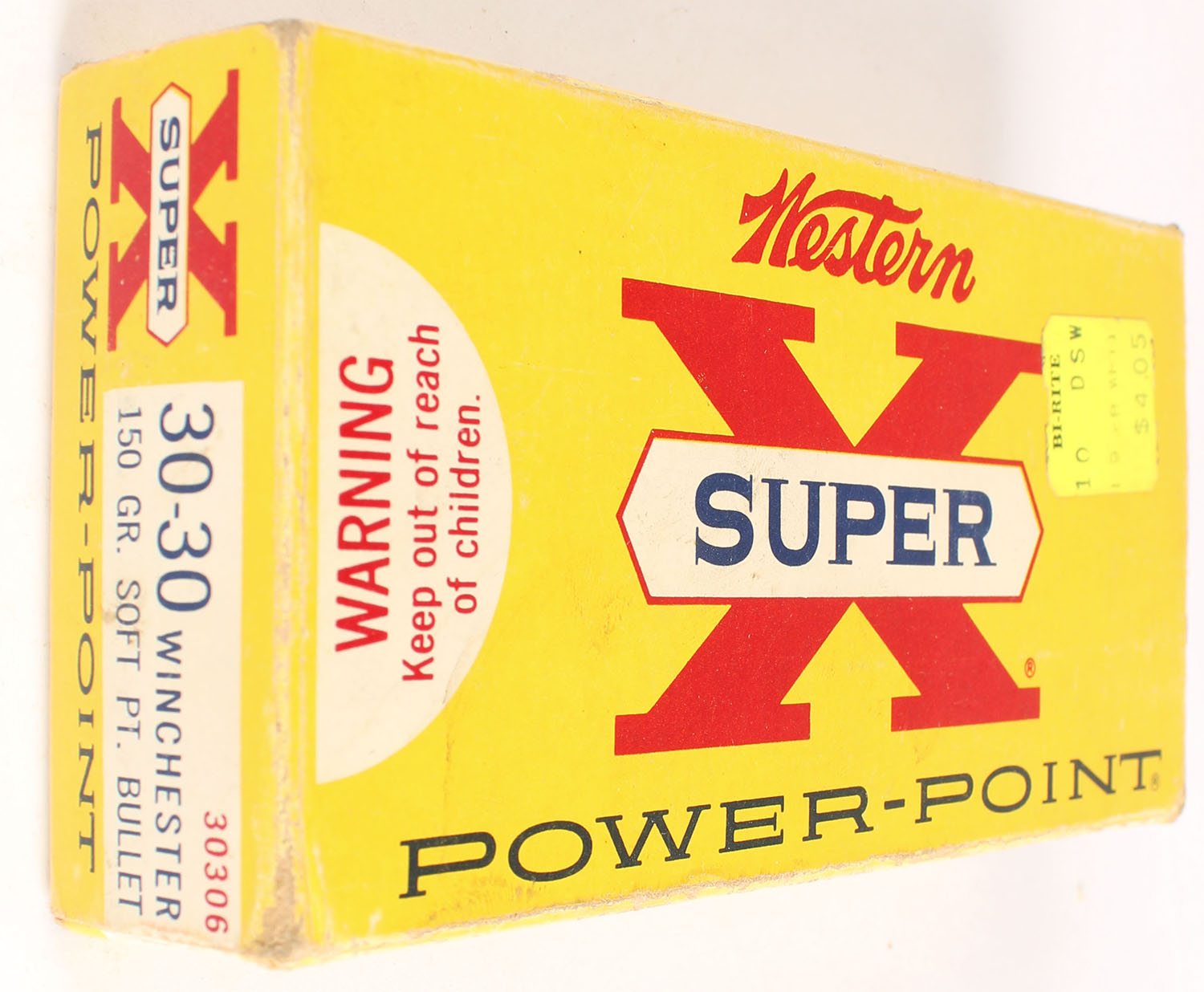 Western, Super-X Power-Point, .30-30 Winchester, 150 Grain Soft Point Bullet, Full, 1pc. Yellow white & red box, box is solid with excellent color, very minor age soiling, some edge & corner wear, end flaps are solid, ammo is excellent. Grade: Excellent - Value: 14 to 40