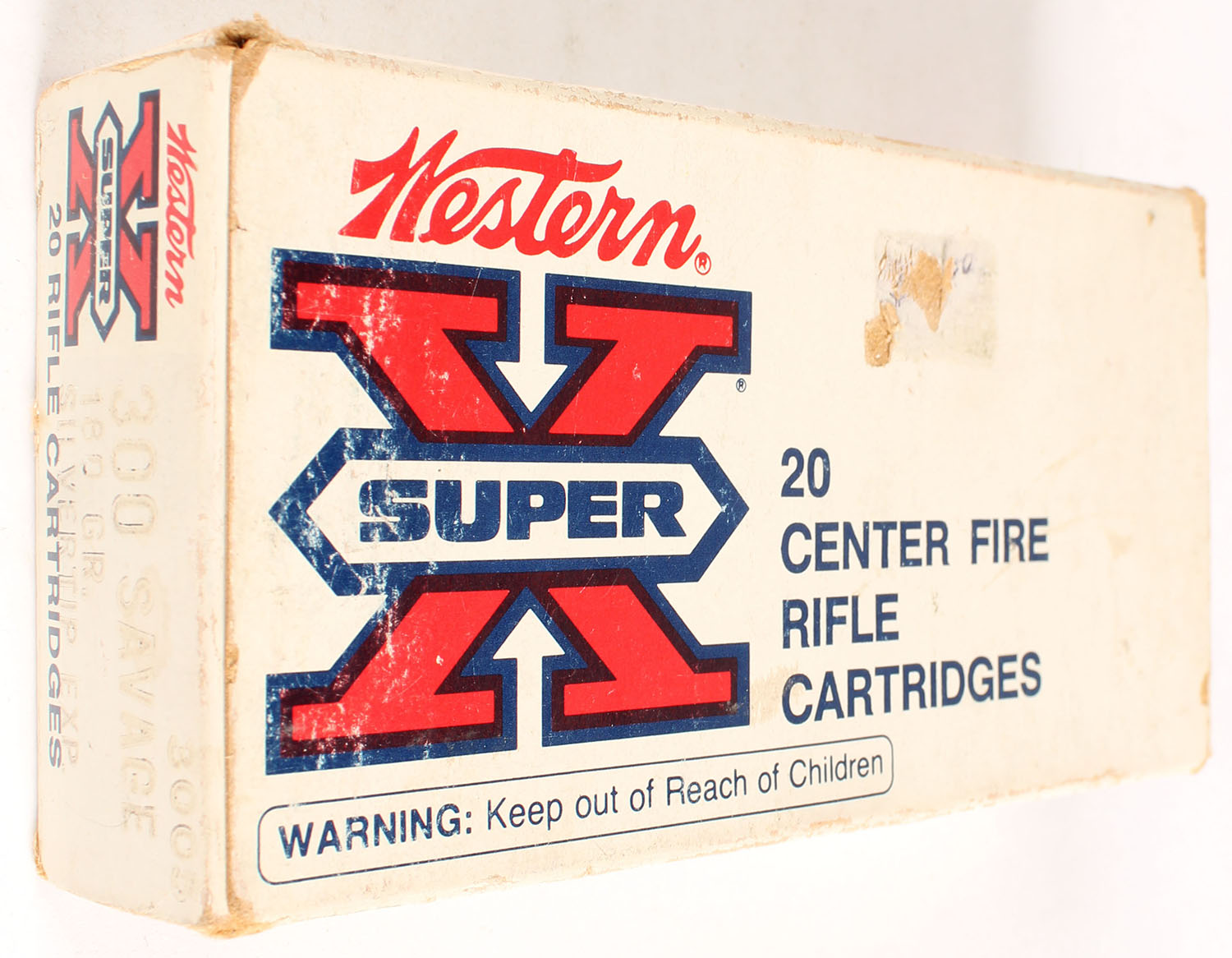 Western, Super-X, .300 Savage, 180 Grain Silvertip Expanding, Full, 1pc. White red & blue box, box is solid with very good color, some age soiling & shelf wear, some edge & corner wear, end flaps are solid, ammo is excellent to minty. Grade: Very Good ++ - Value: 20 to 60