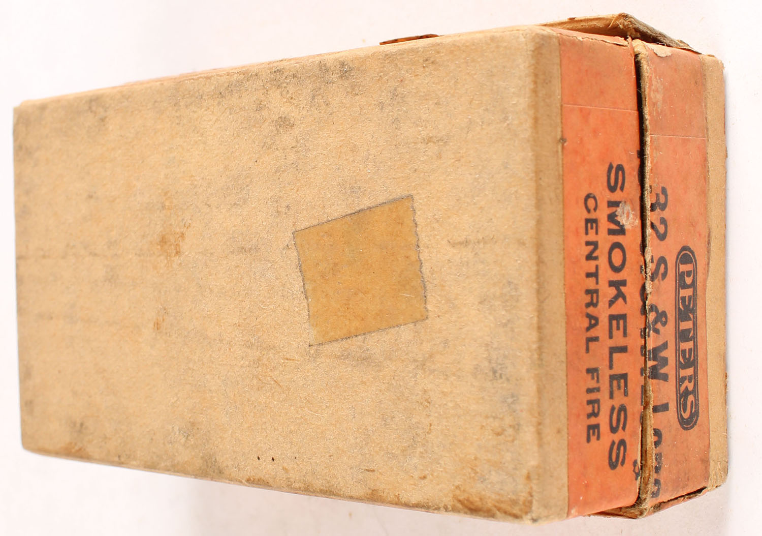 Peters, Smokeless C.F. Cartridges, .32 Smith & Wesson Long, Full, 1pc. Buff & orange box, box is solid with excellent color, minor age soiling, vertical seam splits to all corners of lid, some edge & corner wear, labels are intact, ammo is very good to excellent. Grade: Very Good + - Value: 20 to 60