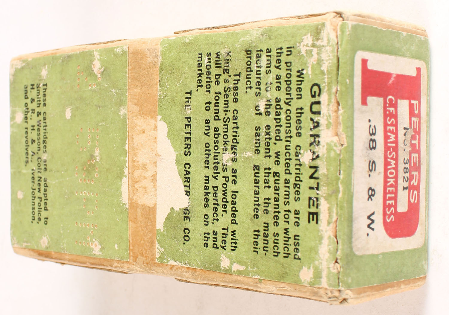 Peters, C.F. Cartridges, .38 Smith & Wesson, Semi-Smokeless Powder, Full, 2pc. Buff box with white green & red wraparound label, box is solid with very good color, some age soiling & shelf wear, very minor corner wear, edges are crisp, label is intact, ammo is very good. Grade: Excellent - Value: 30 to 120
