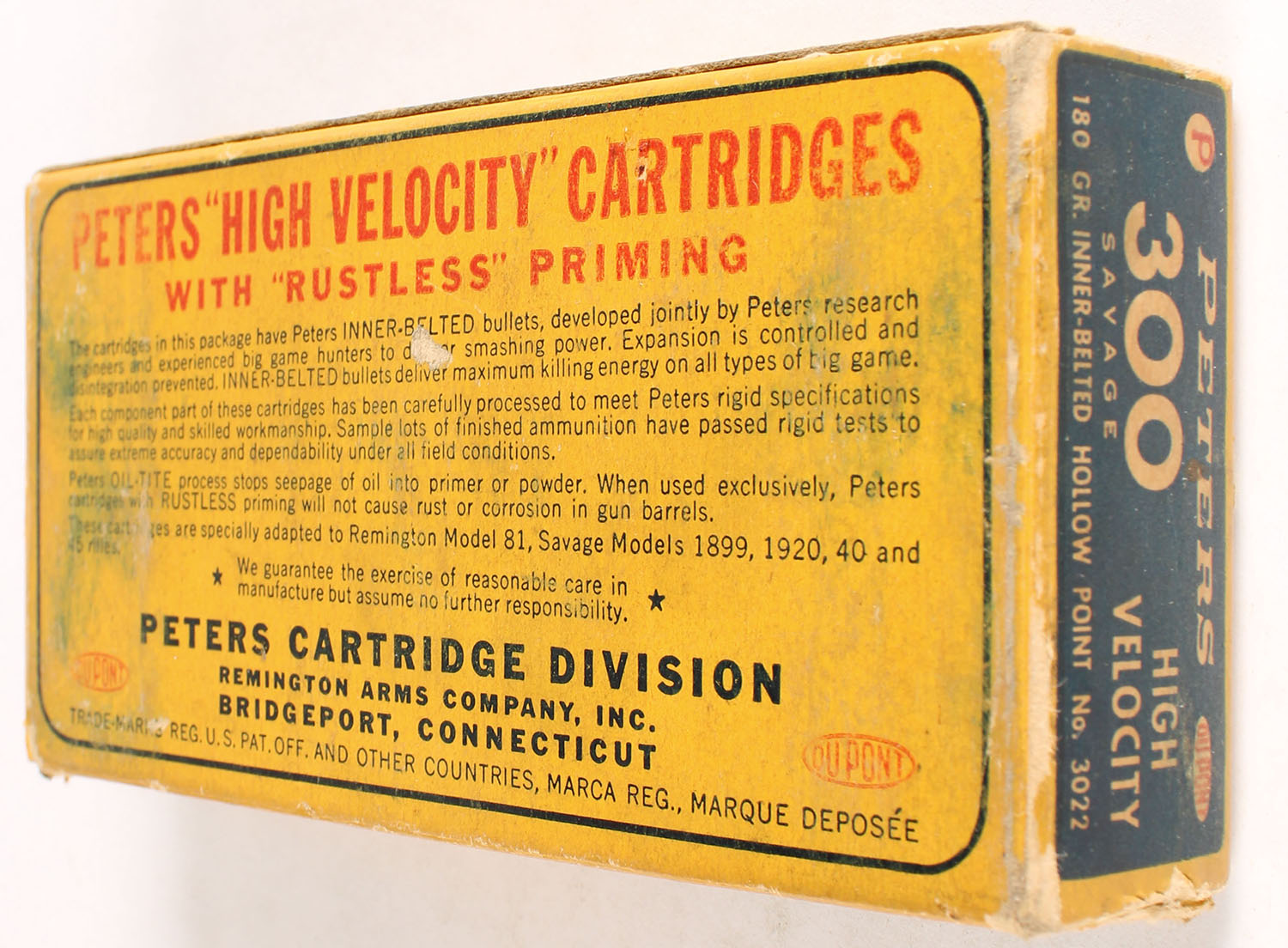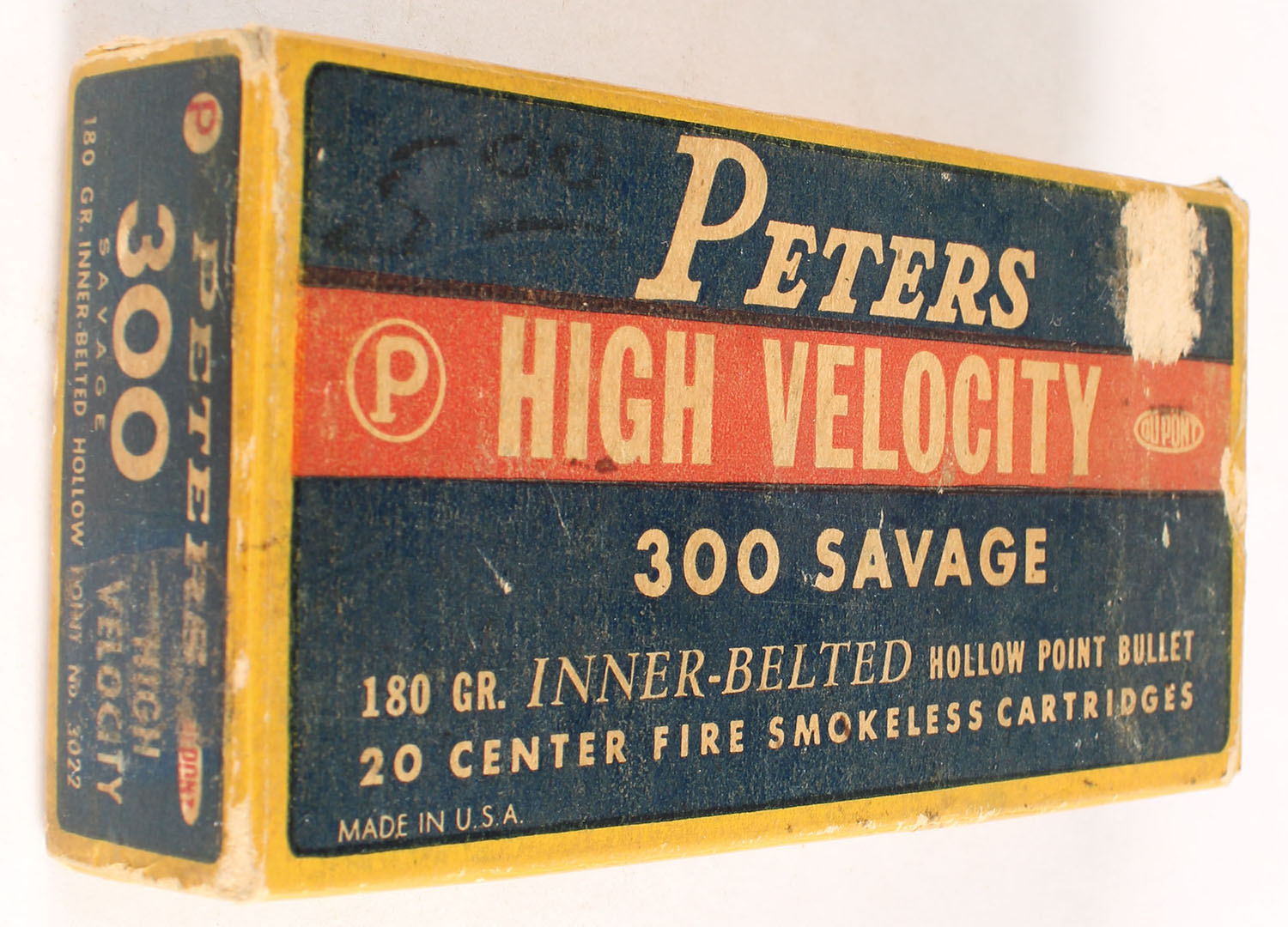 Peters, High Velocity, .300 Savage, 180 Grain Inner-Belted Hollow Point Bullet, Full, 1pc. Blue yellow & red box, box is solid with good color, age soiling scuff on top, front has been written on, minor shelf wear, very minor corner wear, edges are crisp, end flaps are solid, ammo is excellent. Grade: Very Good + - Value: 20 to 60