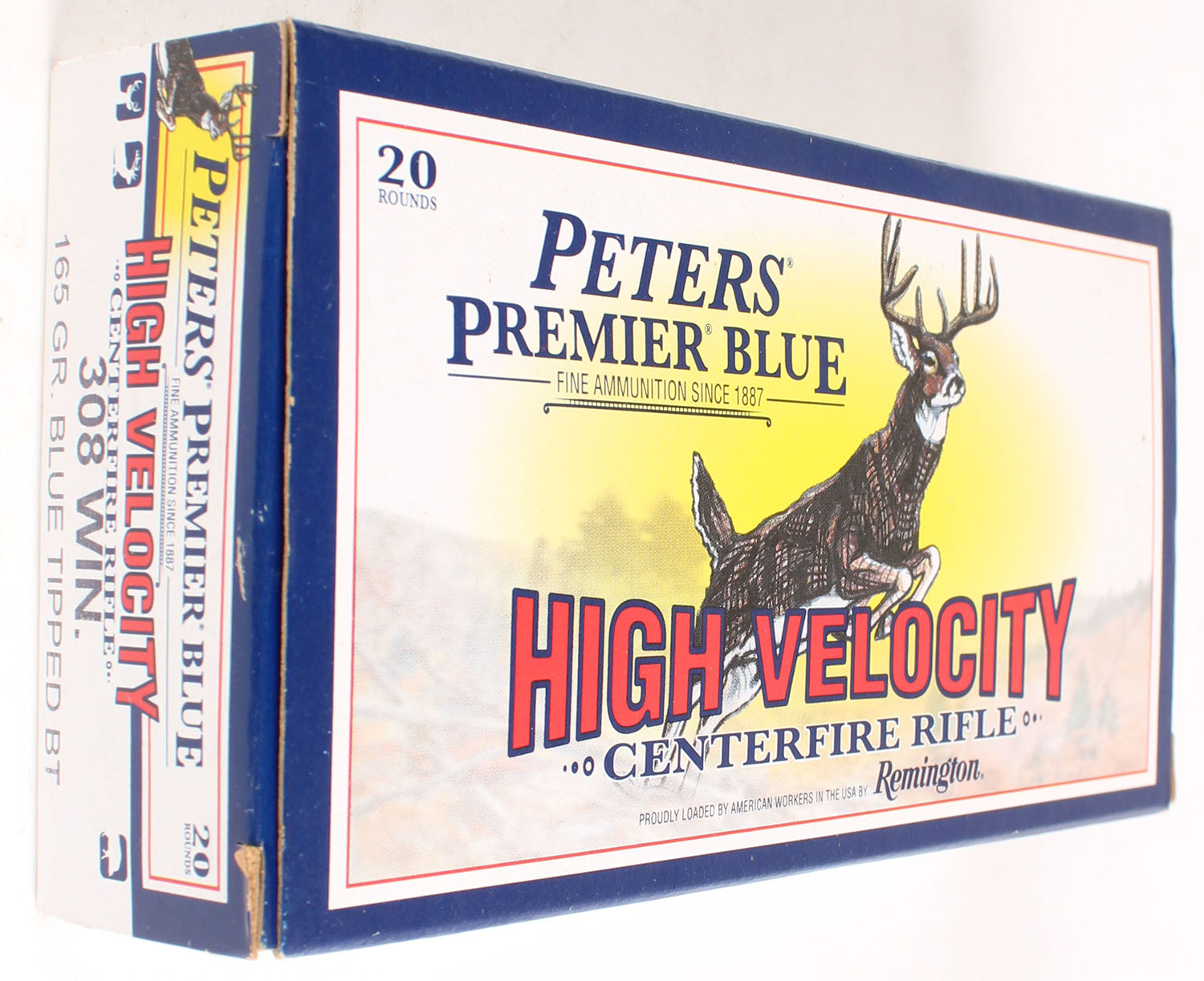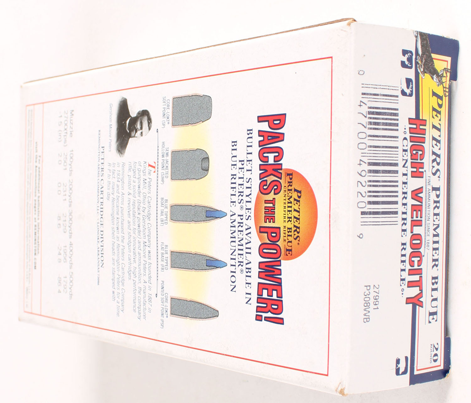 Peters, Premier Blue High Velocity, .308 Winchester, 165 Grain Blue Topped Boat Tail, Full, 1pc. White & blue box, box is MINT with minty color, corners are sharp, edges are crisp, end flaps are solid, ammo is minty. Grade: MINT - Value: 30 to 90