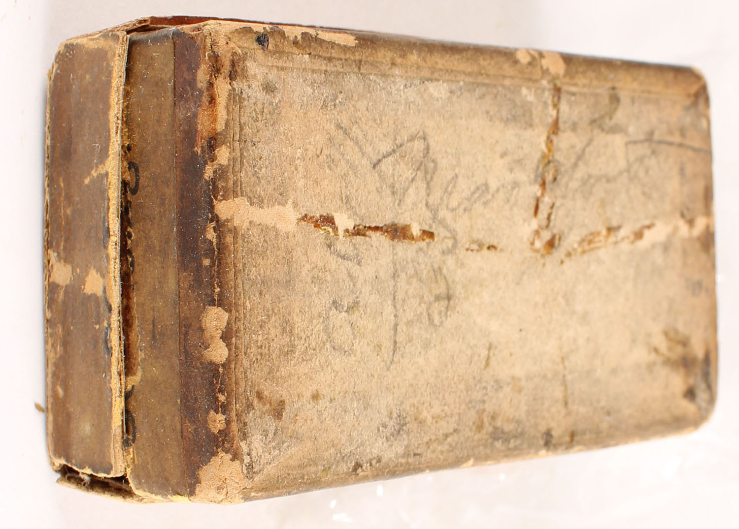 U.S., Metallic Cartridges, .30 Long Rim Fire, Partial 43rds., 2pc. Buff box with gray top & buff side sealing labels, all sides & ends of lid have been torn & repaired, missing back side of lid, fair to good color, age soiling edge & corner wear, side sealing label is 90% intact, ammo is very good. Grade: Good ++ - Value: 30 to 90