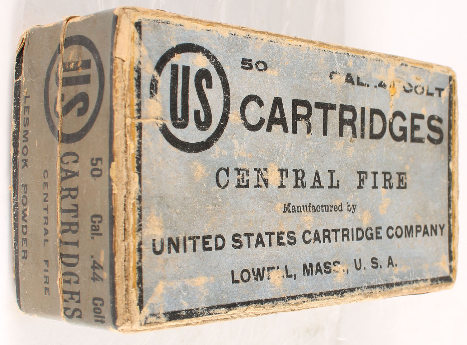 U.S., Central Fire Cartridges, .45 Colt, Lesmok Powder, Full, 2pc. Buff box with blue top & side sealing labels, 3 seam splits to bottom edges, 2 partial seam splits on top edges, good color, minor age soiling, shelf wear, edge & corner wear, labels are intact, ammo is fair. Grade: Fair - Value: 30 to 90