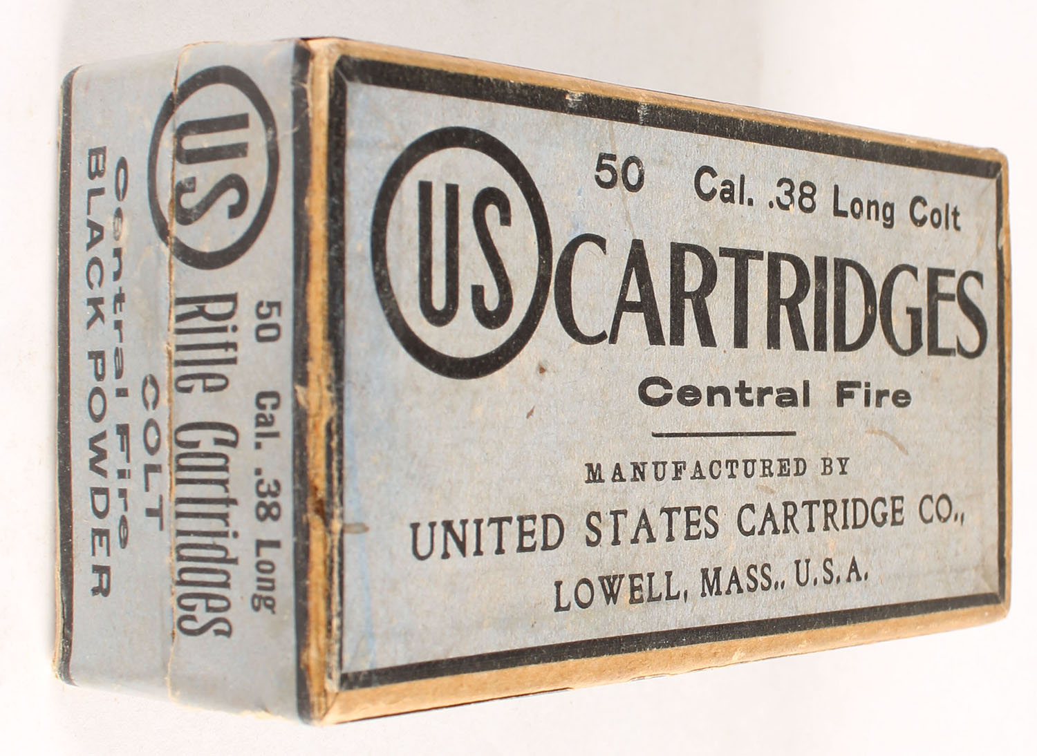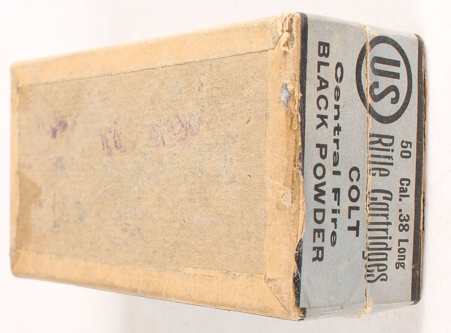 U.S., Central Fire Cartridges, .38 Long Colt, Black Powder, Full, 2pc. Buff box with blue top & side sealing labels, box is solid with excellent color, all seams of lid have been repaired, very minor age soiling, some edge & corner wear, labels are intact, ammo is excellent. Grade: Very Good ++ - Value: 50 to 200