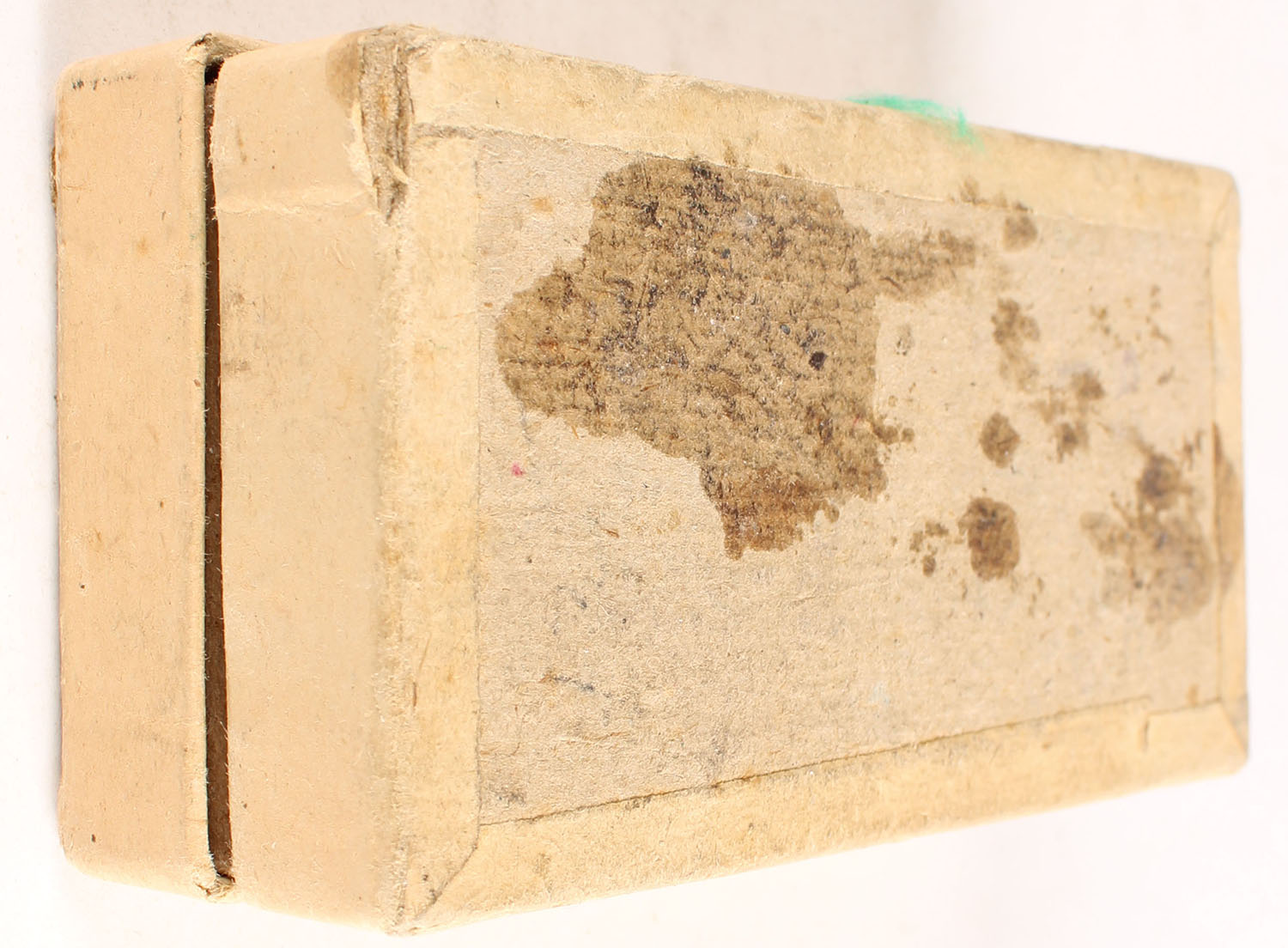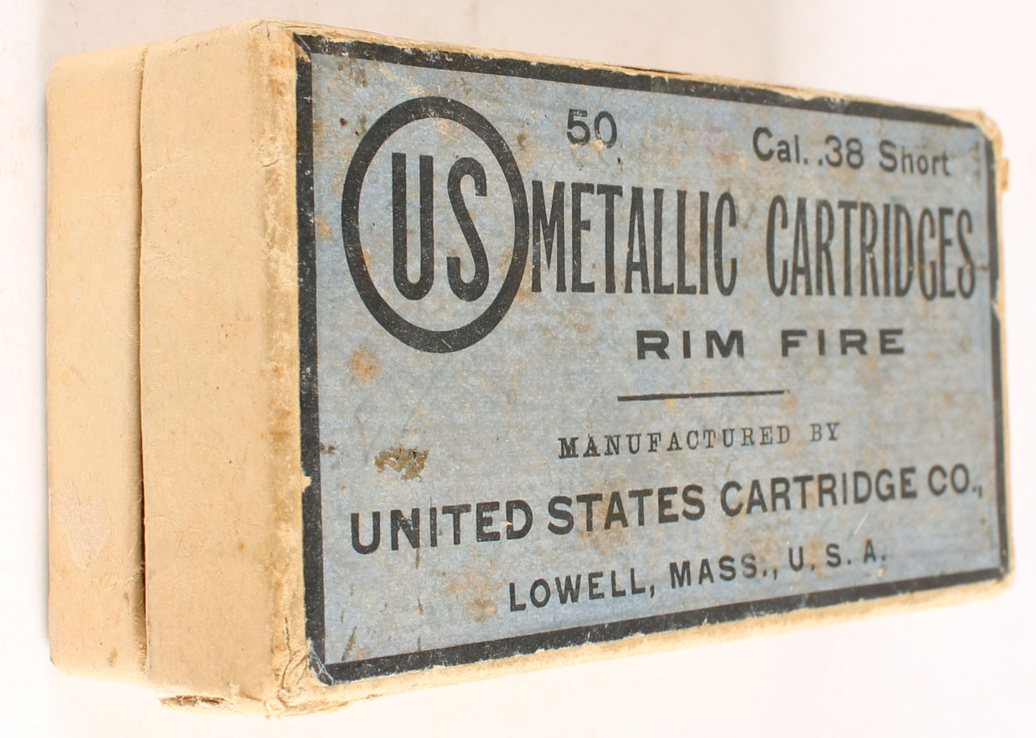 U.S., Metallic Cartridges, .38 Short Rim Fire, Partial 48rds. 2pc. Buff box with blue top label, side sealing label is missing, very good color, minor age soiling, some edge & corner wear, top label is intact, ammo is fair. Grade: Good ++ - Value: 16 to 60