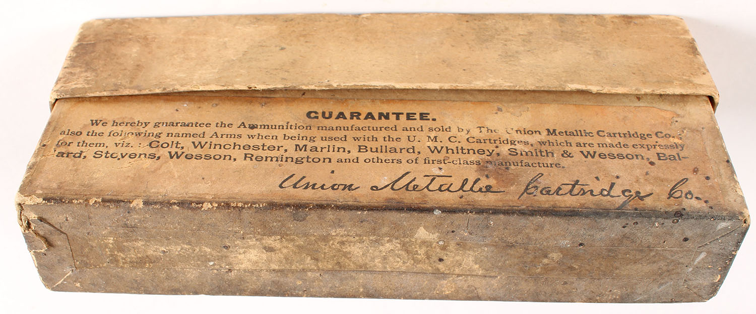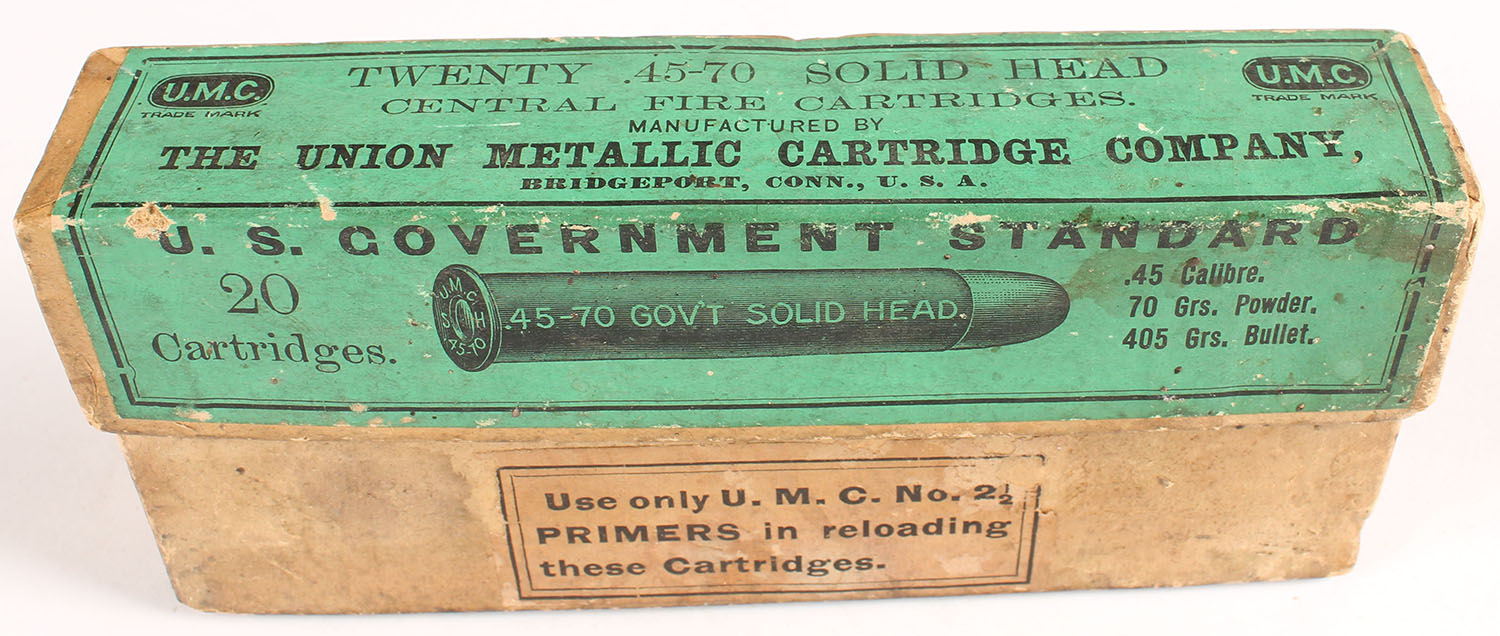 UMC, Central Fire Cartridges, .45-70 Government, 405 Grs. Bullet, Partial 2 incorrect rds. (WRA H/S), 2pc. Buff box with green label, box is solid with very good to excellent color, minor age soiling, some staining, minor edge & corner wear, label is intact, ammo is excellent. Grade: Very Good - Value: 4 to 20