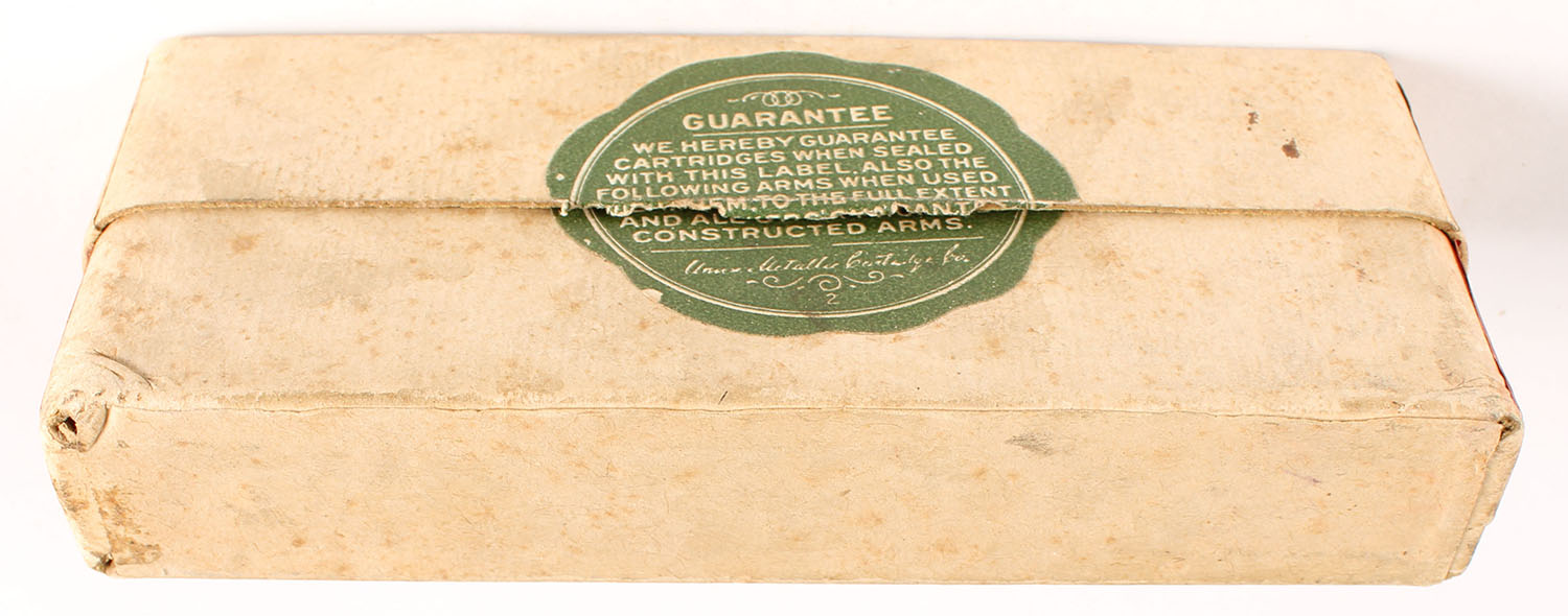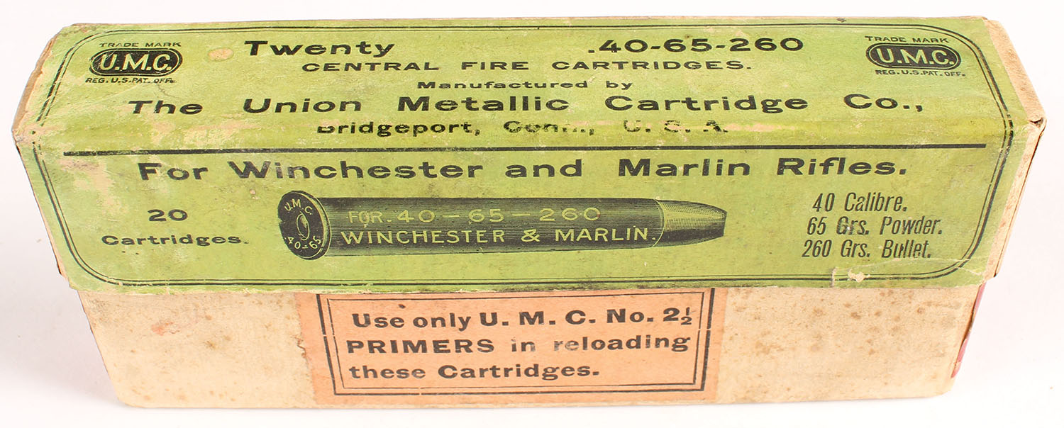 UMC, Central Fire Cartridges, .40-65 Winchester, 260 Grs. Bullet, Partial 1rd., 2pc. Buff box with green label, box is solid with very good to excellent color, some color fading & shelf wear, minor staining & corner wear, very minor edge wear, label is intact, ammo is excellent. Grade: Very Good - Value: 2 to 20
