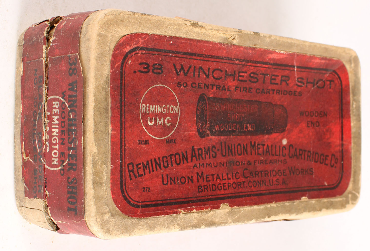 REM-UMC, Central Fire Cartridges, .38 Winchester Shot, No.10 Chilled Shot, Wooden End, Black Powder, Partial 2rds. of mixed REM-UMC H/S, box has repaired tear on back side, good to very good color, age soiling, minor shelf wear, some edge & corner wear, labels are intact, ammo is very good. Grade: Good - Value: 8 to 40