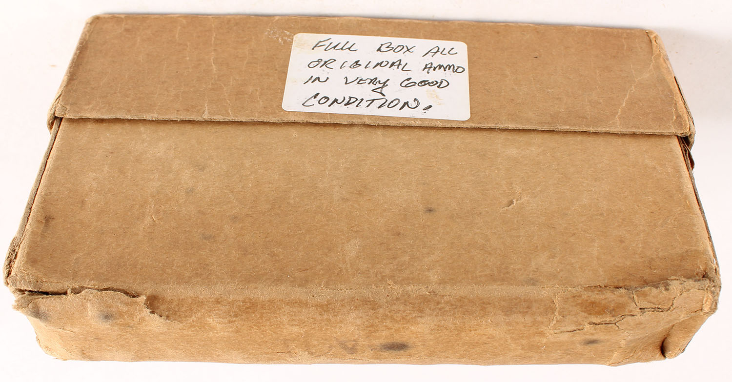 REM-UMC, Kleanbore, .30 Army (.30-40 Krag), 220 Grain Metal Cased Bullet, Full of incorrect ammo, 2pc. Buff box with buff & red label, box is solid with very good color, some age soiling, staining, sticker on back, edge & corner wear, ammo is very good. Grade: Good - Value: 6 to 30