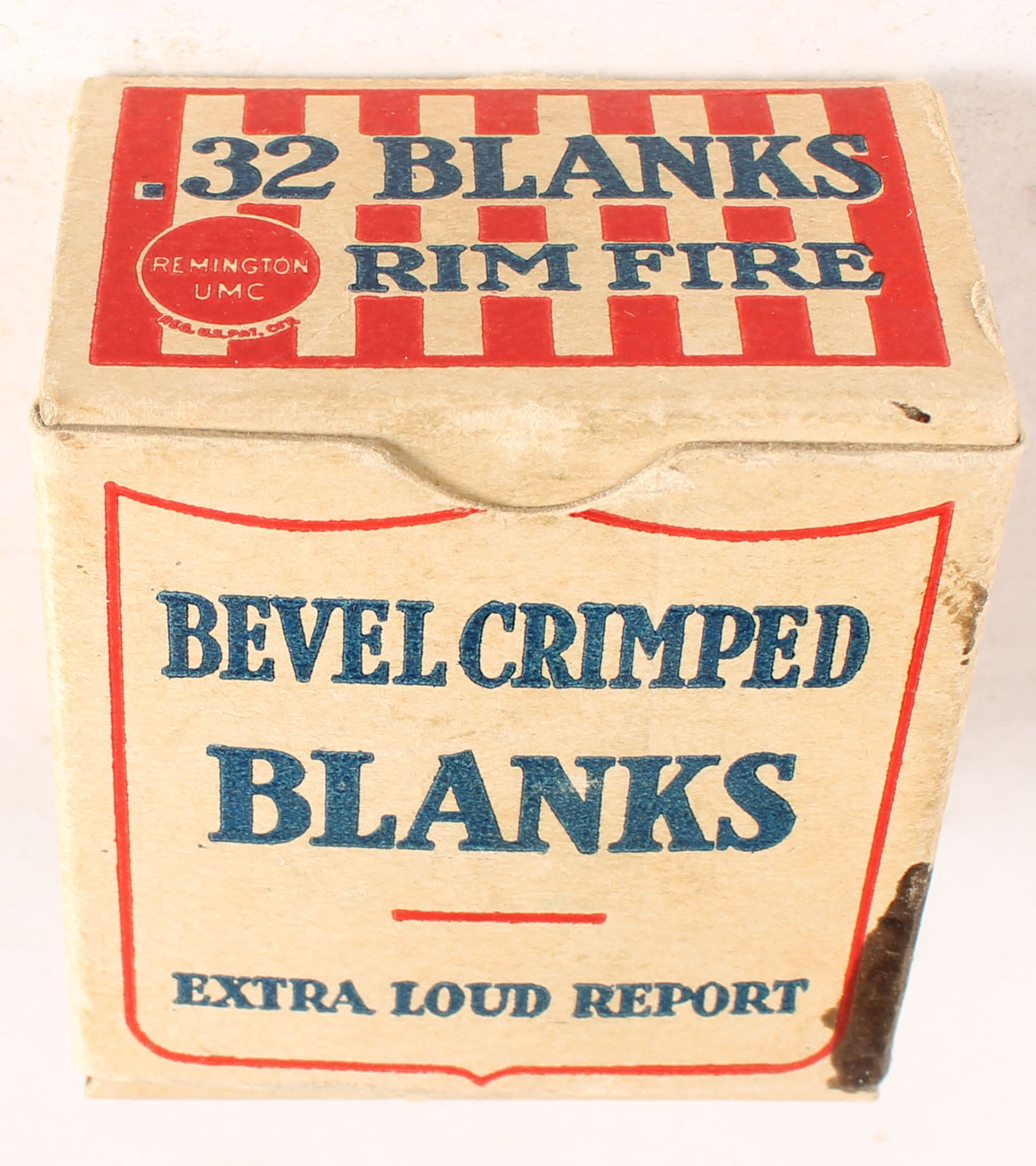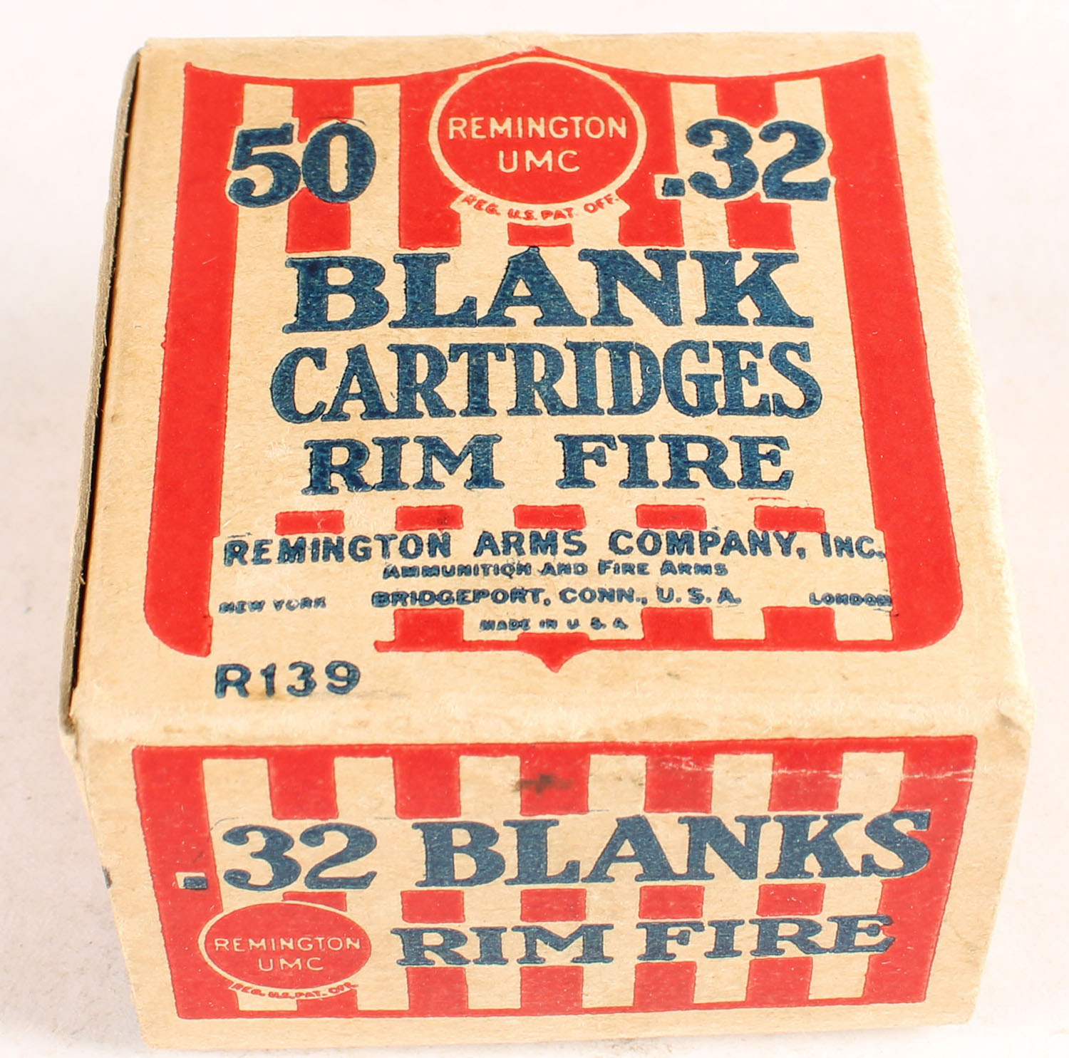 REM-UMC, Blank Rim Fire Cartridges, .32 Rim Fire, Full, 1pc. Buff red & blue box, box is solid with excellent color, very minor age soiling, corners are mostly sharp, edges are crisp, back has been written on, top flap is solid, ammo is excellent. Grade: Excellent - Value: 8 to 40