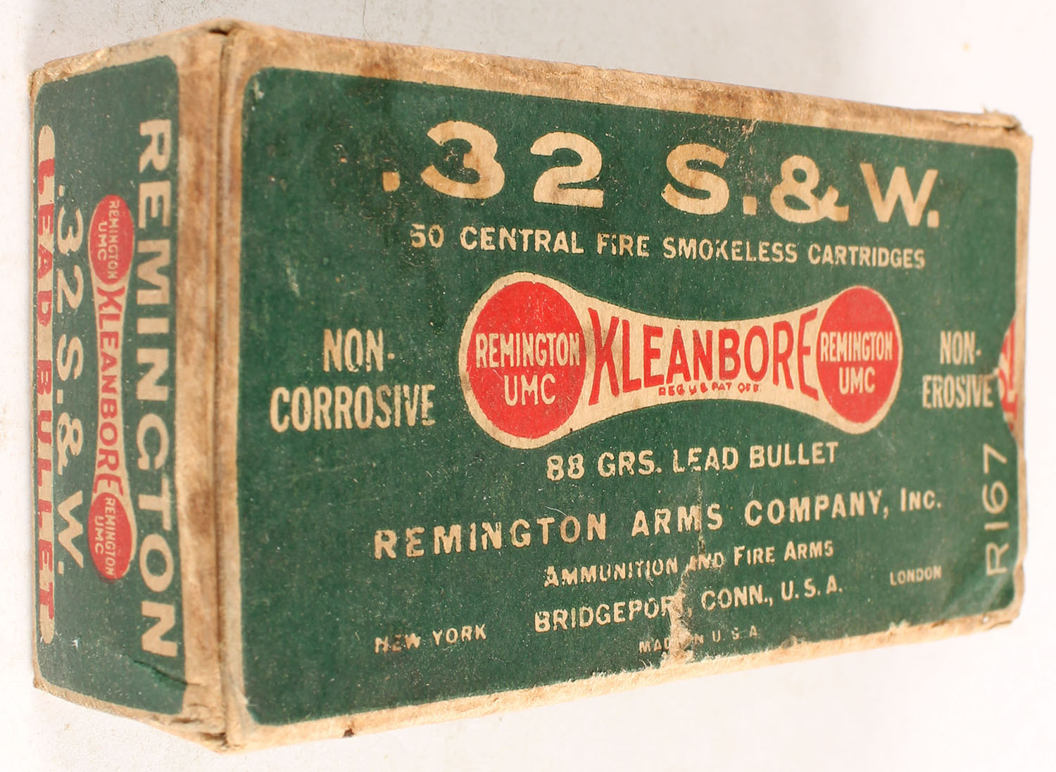 Remington, Kleanbore, .32 Smith & Wesson, 88 Grs. Lead Bullet, Partial 25rds. 1pc. Green brown & red dog bone box, box is solid with very good color, some age soiling, corner wear, minor edge wear, scuff on bottom, end flaps are solid, ammo is very good. Grade: Very Good + - Value: 8 to 40