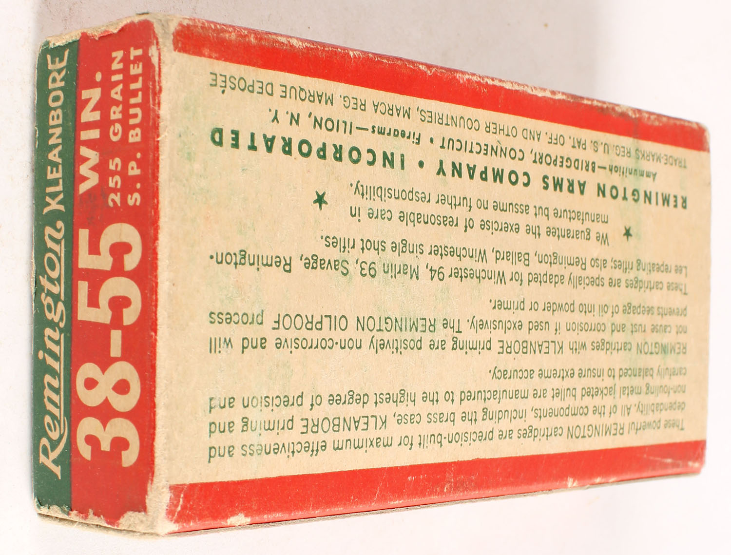 Remington, Kleanbore, .38-55 Winchester, 255 Grain Soft Point Bullet, Full, 1pc. Green buff & red box, box is solid with very good color, some age soiling & shelf wear, some edge & corner wear, stain on front, end flaps are solid, ammo is very good to excellent - Value: 20 to 60