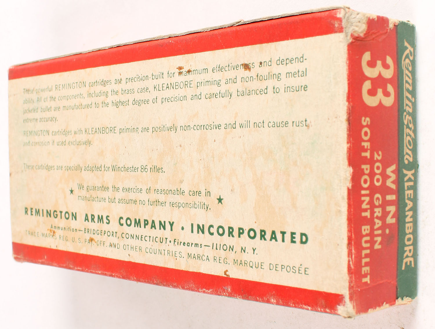 Remington, Kleanbore, .33 Winchester, .200 Grain Soft Point Bullet, Full, 1pc. Green buff & red box, box is solid with excellent color, very minor age soiling, minor corner wear, very minor edge wear, end flaps are solid, ammo is fair. Grade: Excellent - Value: 50 to 150