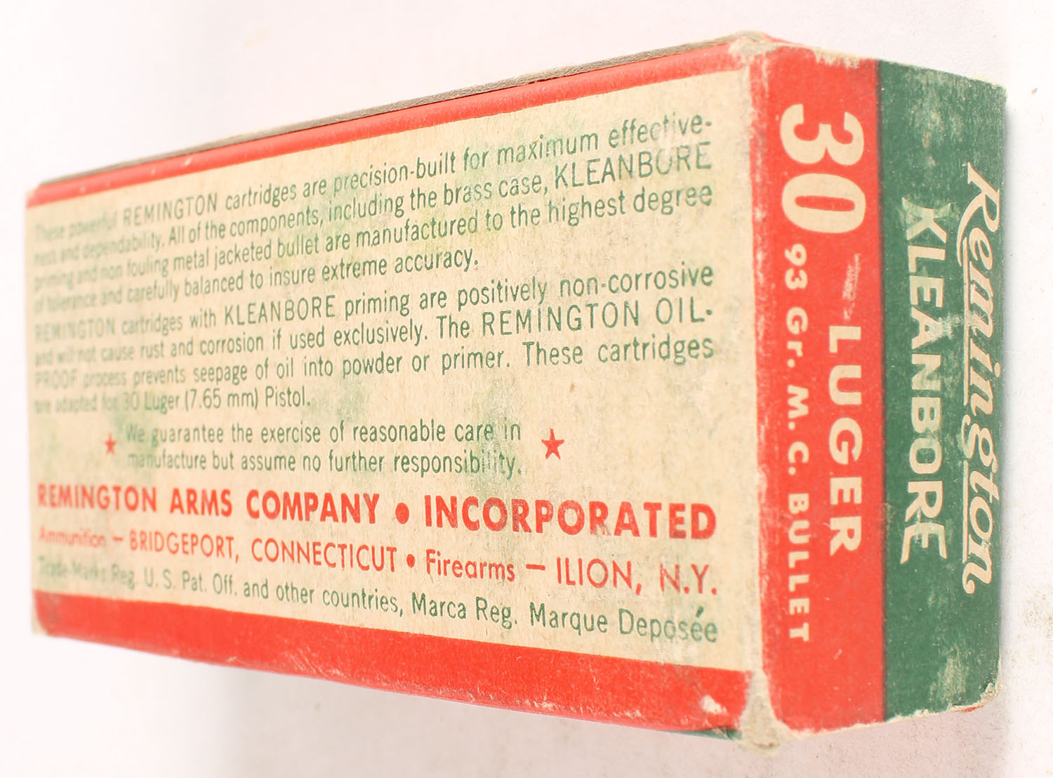 Remington, Kleanbore, .30 Luger (7.65mm), 93 Grain Metal Case Bullet, Full, 1pc. Green buff & red box, box is solid with very good to excellent color, minor age soiling & shelf wear, some corner wear, edges are mostly crisp, end flaps are solid, ammo is excellent. Grade: Excellent - Value: 16 to 60