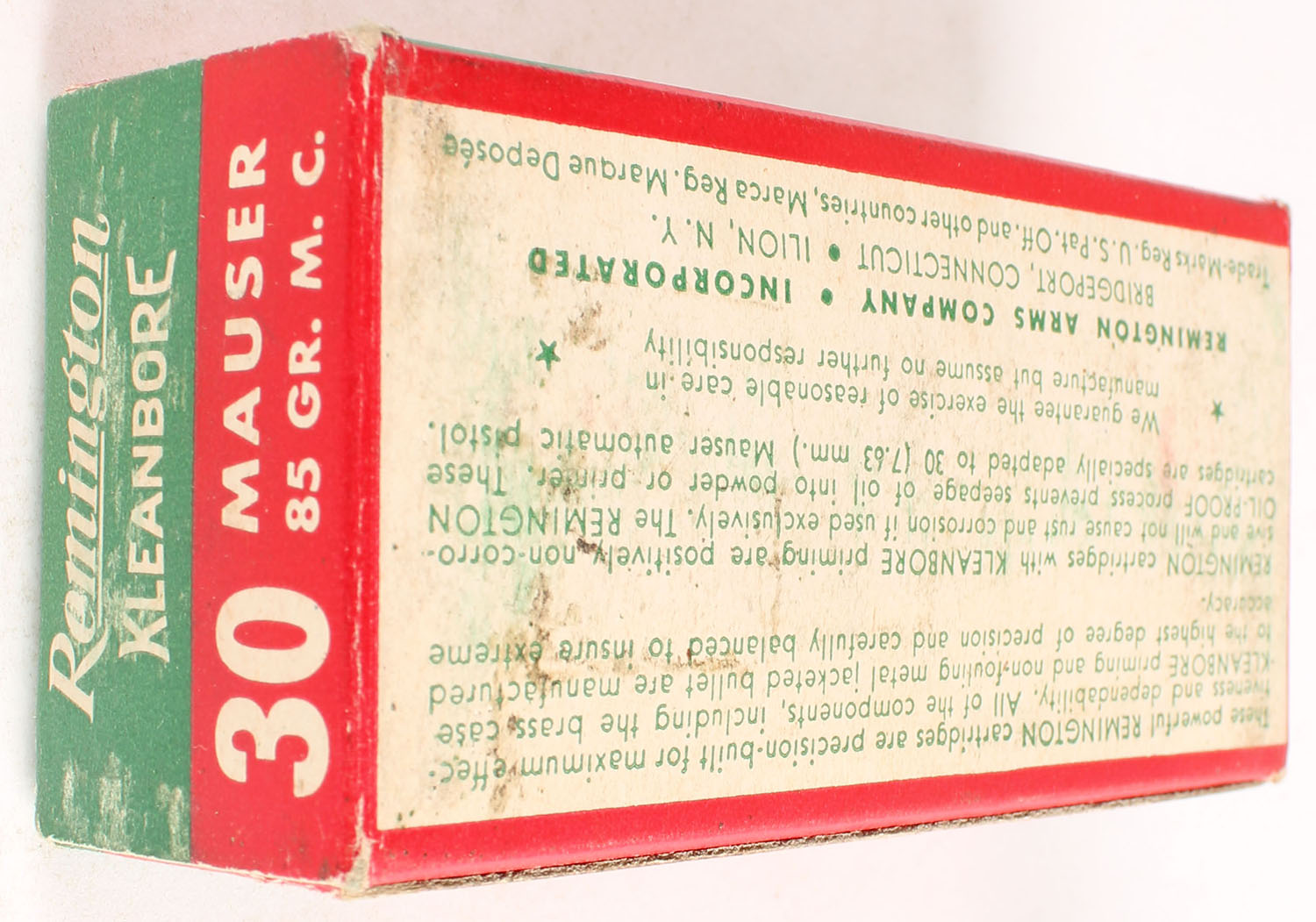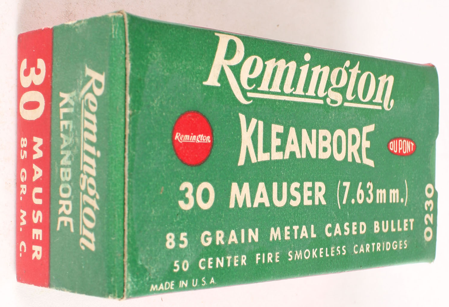 Remington, Kleanbore, .30 Mauser (7.63mm), 85 Grain Metal Cased Bullet, Full, 1pc. Green white & red box, box is solid with excellent color, very minor corner wear, edges are crisp, end flaps are solid, ammo is excellent. Grade: Excellent + - Value: 10 to 40
