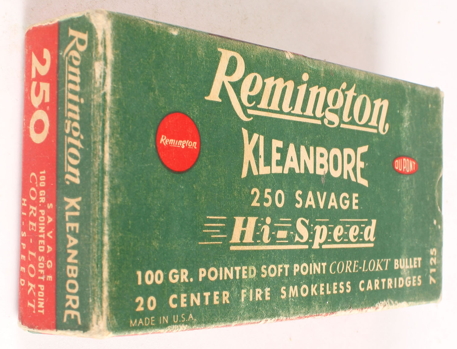 Remington, Kleanbore Hi-Speed, .250 Savage, 100 Gr. Pointed Soft Point Core-Lokt Bullet, Partial 17rds., 1pc. Green buff & red box, box is solid with very good color, minor age soiling & shelf wear, some edge & corner wear, end flaps are solid, ammo is excellent. Grade: Very Good + - Value: 14 to 40