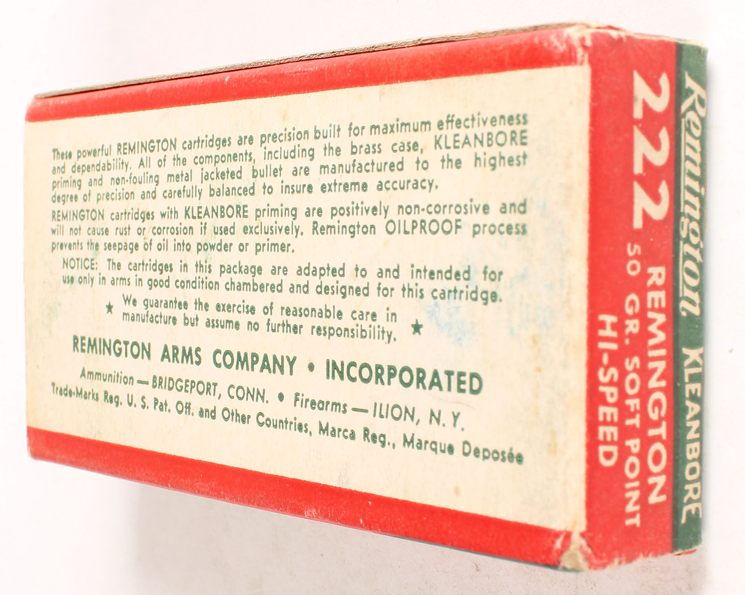 Remington, Kleanbore Hi-Speed, .222 Remington, 50 Grain Soft Point Bullet, Full, 1pc. Green white & red box, box is solid with excellent color, minor shelf & corner wear, edges are crisp, end flaps are solid, ammo is excellent. Grade: Excellent - Value: 10 to 40