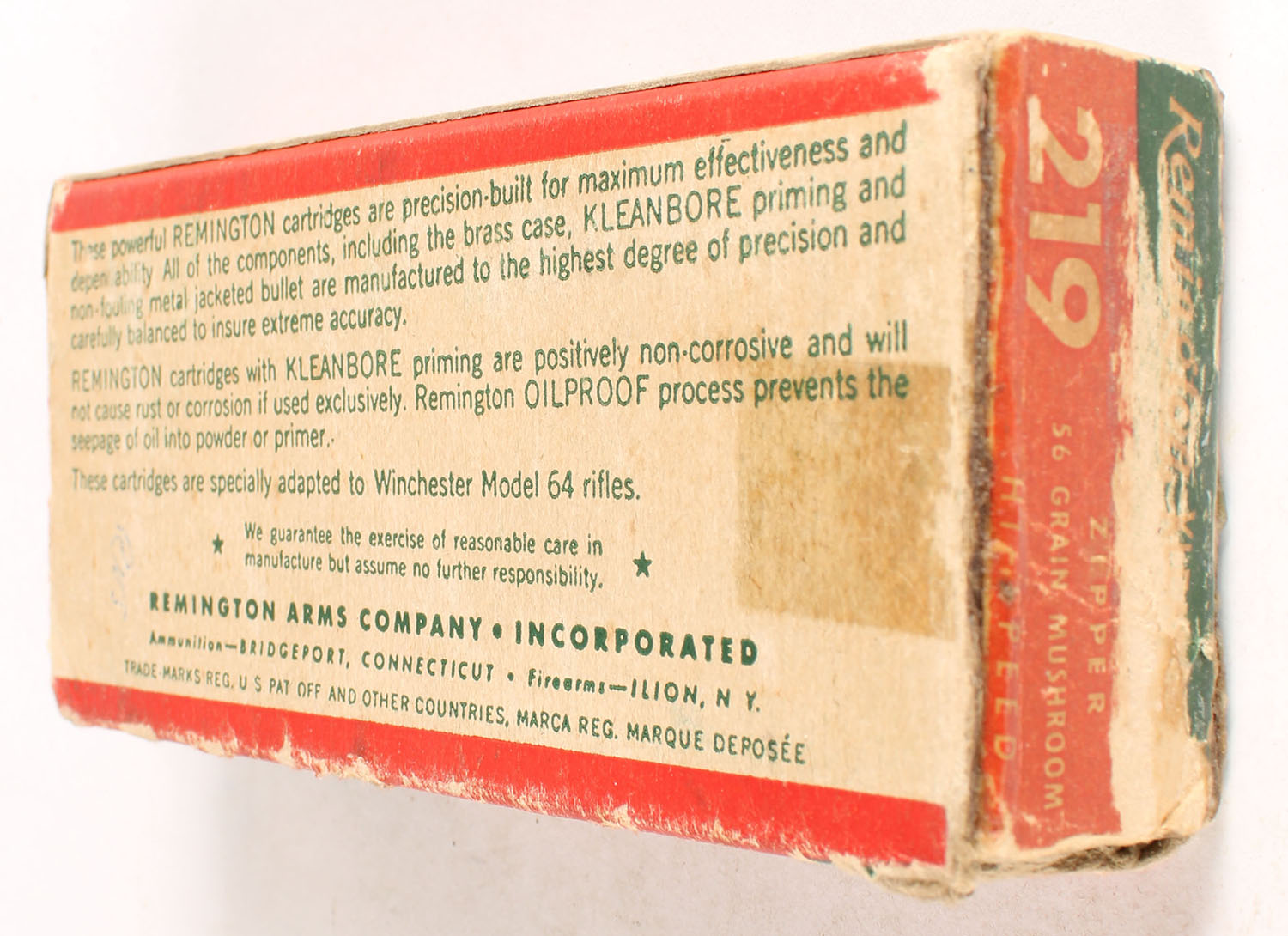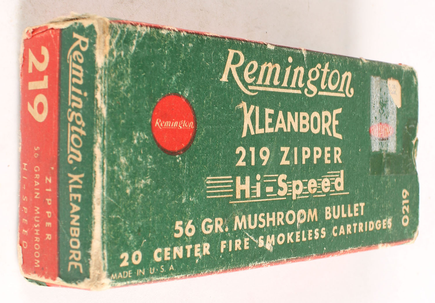 Remington, Kleanbore Hi-Speed, .219 Zipper, 56 Gr. Mushroom Bullet, Full of Fired Brass, 1pc. Green buff & red box, box is solid with very good color, minor age soiling, some shelf & corner wear, minor edge wear, end flaps are solid, brass is very good. Grade: Very Good - Value: 8 to 40