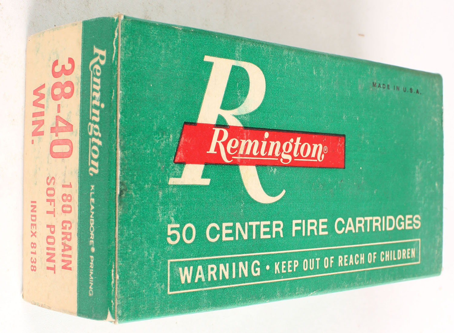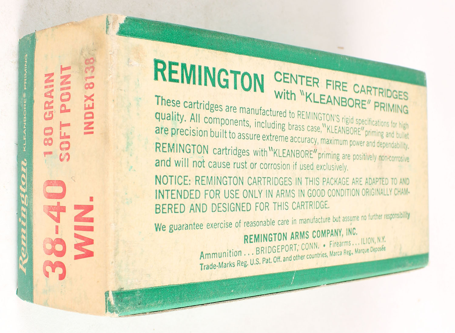 Remington, Center Fire Cartridges, .38-40 Winchester, 180 Grain Soft Point, Full, 1pc. Green white & red box, box is solid with excellent color, minor shelf wear, ammo is excellent. Grade: Excellent - Value: 50 to 150