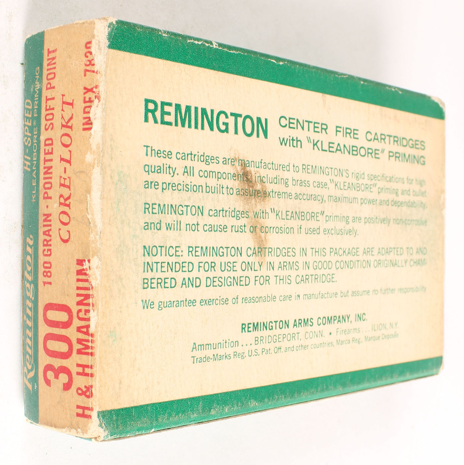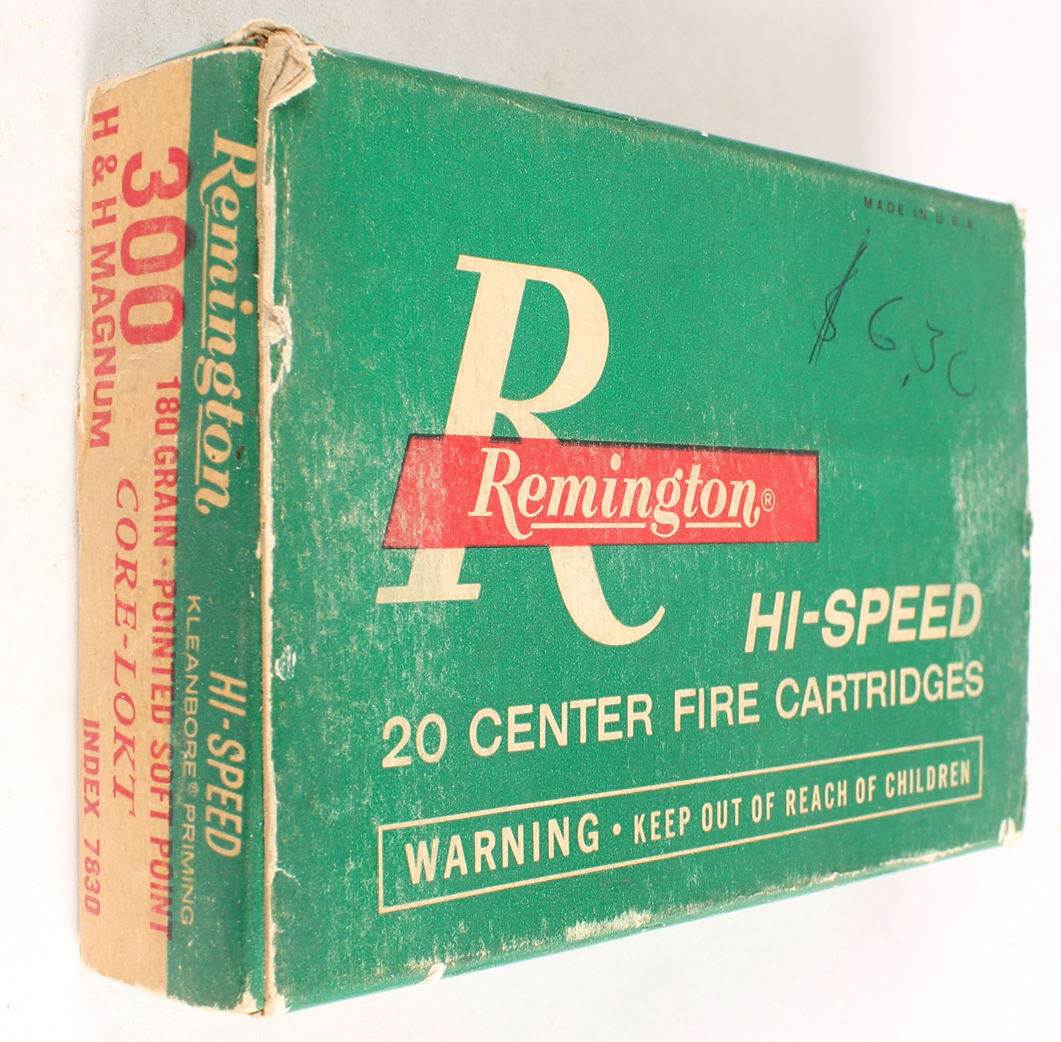 Remington, Center Fire Cartridges, .300 Holland & Holland Magnum, 180 Grain Pointed Soft Point Core-Lokt, Full, 1pc. Green white & red box, box is solid with very good color, some shelf & corner wear, top has been written on, ammo is excellent. Grade: Very Good + - Value: 30 to 90