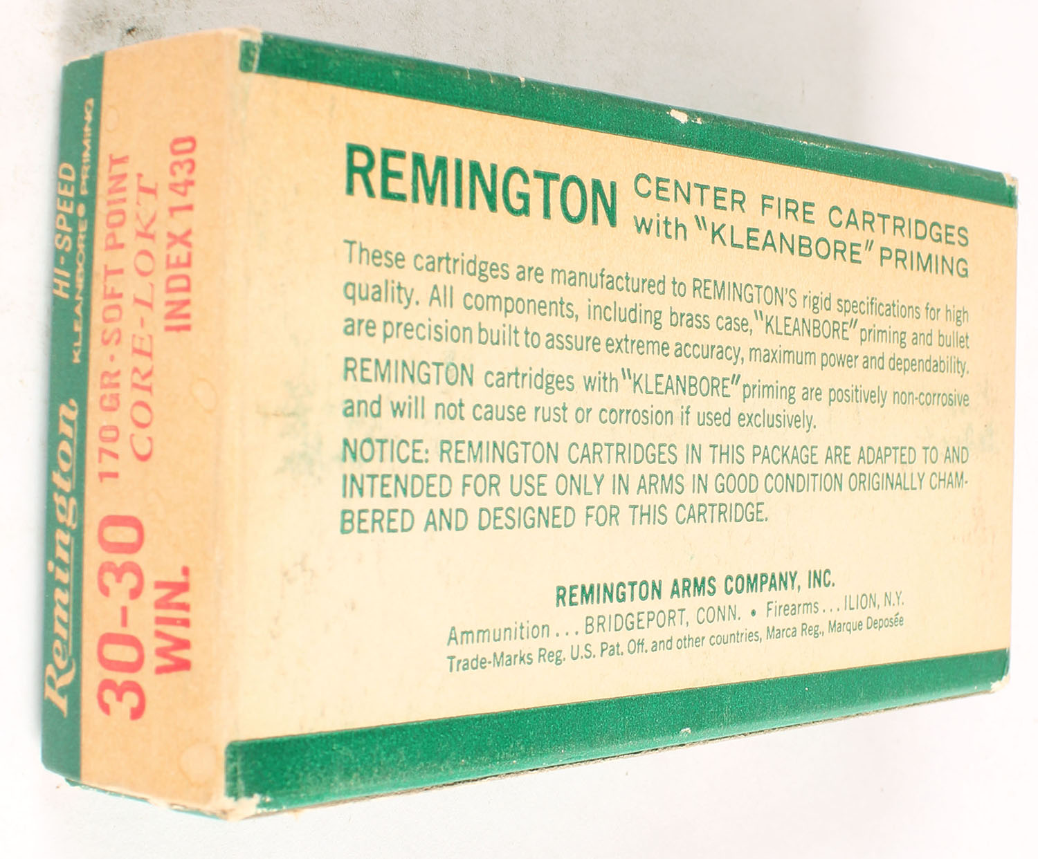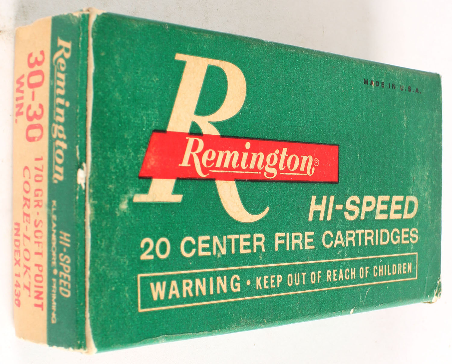 Remington, Hi-Speed, .30-30 Winchester, 170 Grain Soft Point Core-Lokt, Full, 1pc. Green white & red box, box is solid with very good color, some age soiling & corner wear, ammo is excellent. Grade: Very Good ++ - Value: 10 to 30