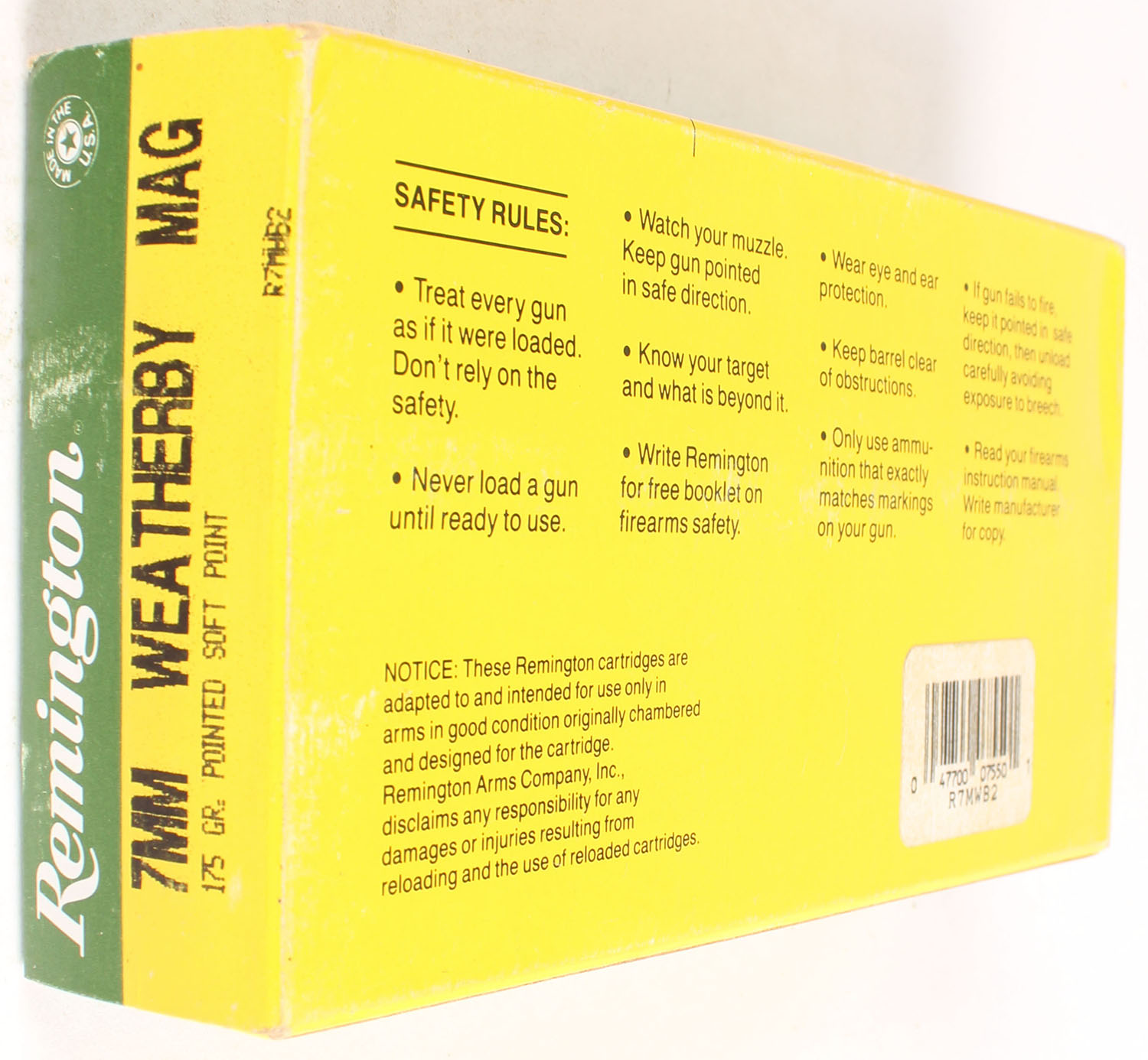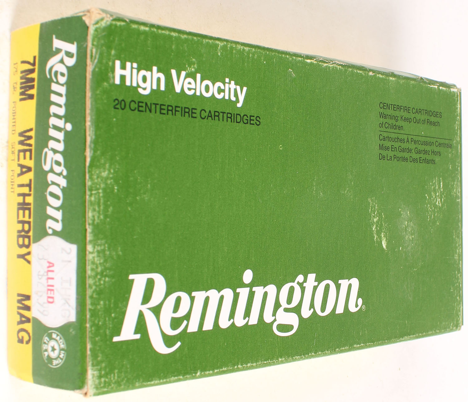Remington, High Velocity, 7mm Weatherby Mag., 175 Gr. Pointed S.P., 1pc, Full, green/yellow box with white/black print, box is solid with minor rub marks & minor corner wear, ammo is excellent. Grade: Excellent - Value: 30 to 60
