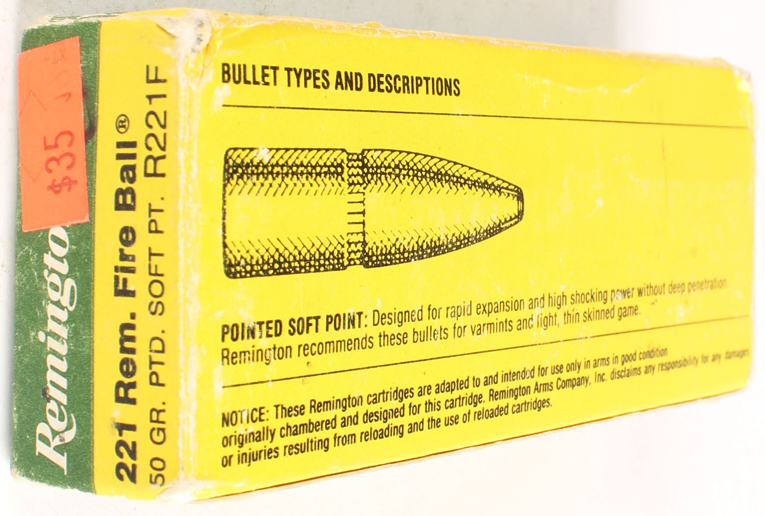 Remington, High Velocity, 221 Rem Fire Ball, 50 Grain Pointed Soft Point, Full, 1pc. Yellow, green, white & black box, box has rub marks with edge & corner wear, end flaps are solid, ammo is excellent. Grade: Very Good ++ - Value: 10 to 50