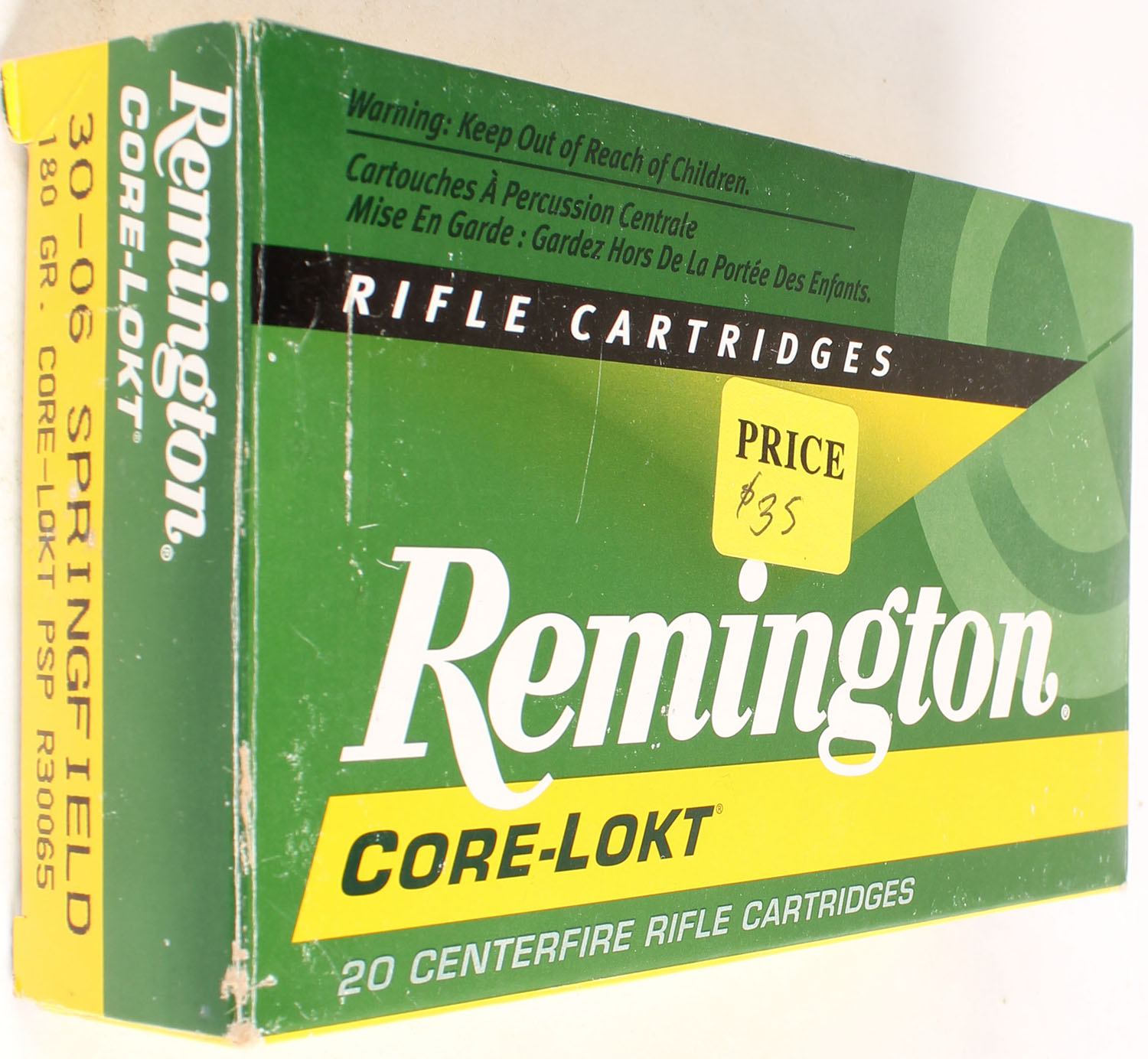 Remington, Core-Lokt, .30-06 Springfield, 180 Gr. Core-Lokt PSP, Full, 1pc. Green yellow & white box, box is very solid with excellent color, end flaps are solid, sticker on top, ammo is excellent. Grade: Excellent + - Value: 20 to 60