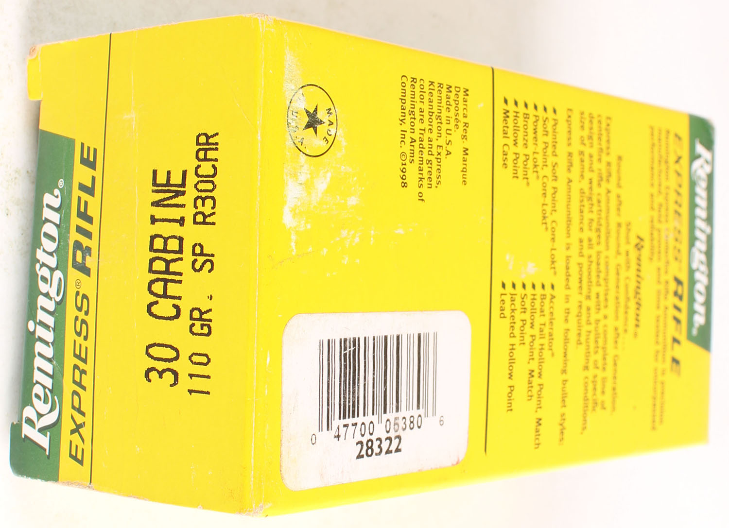 Remington, Express Rifle, 30 Carbine, 110 Gr. S.P, Partial 48rds., 1pc. Yellow, green, white & black box, box is solid with great color, end flaps are solid, ammo is excellent. Grade: Excellent - Value: 20 to 60