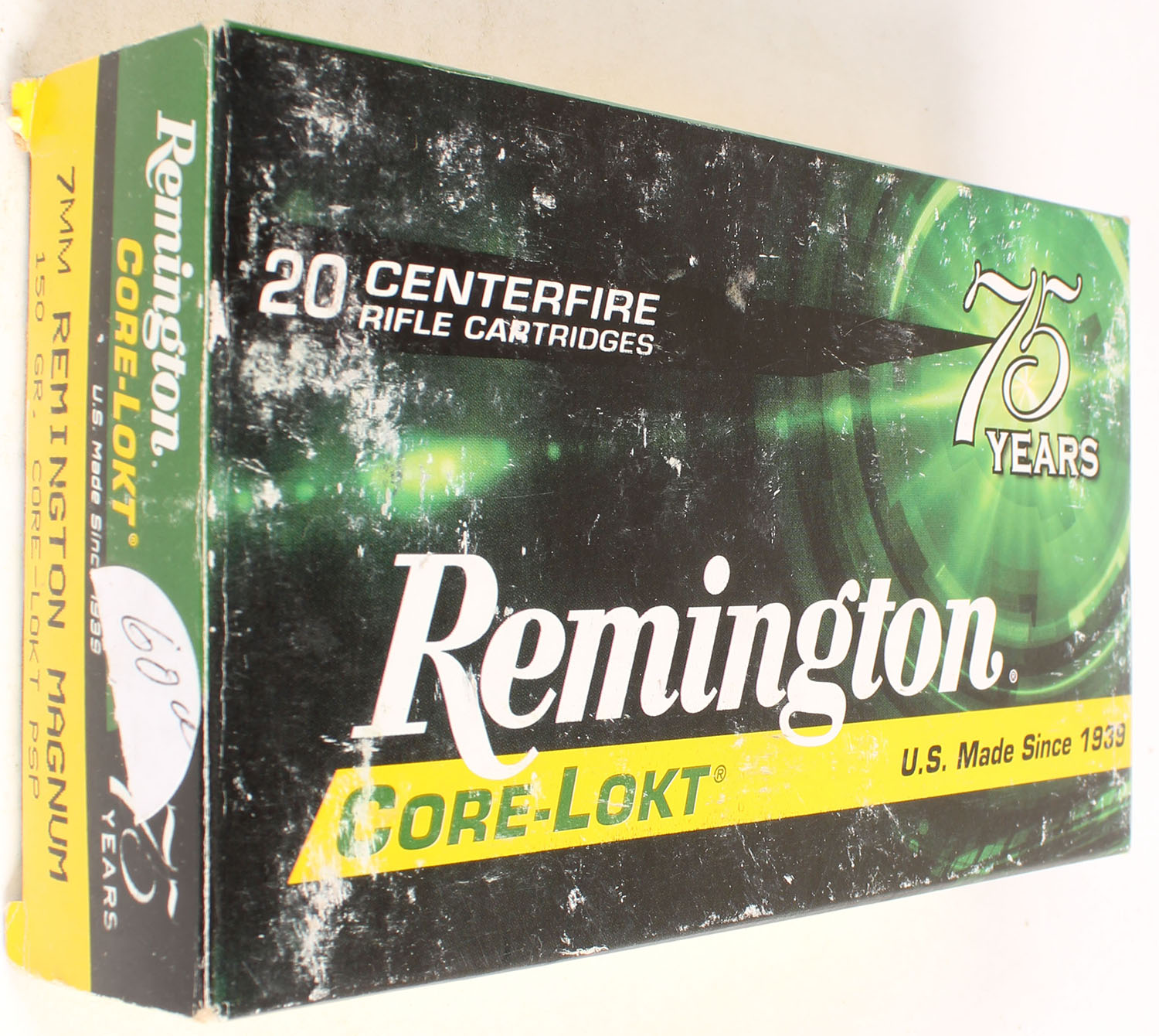 Remington, 75 Years, 7mm Rem. Mag., 150 Gr. Core-Lokt PSP, Full, 1pc. Yellow, green, white & black box, box is solid with rub marks, end flaps are solid, ammo is excellent. Grade: Very Good ++ - Value: 20 to 60