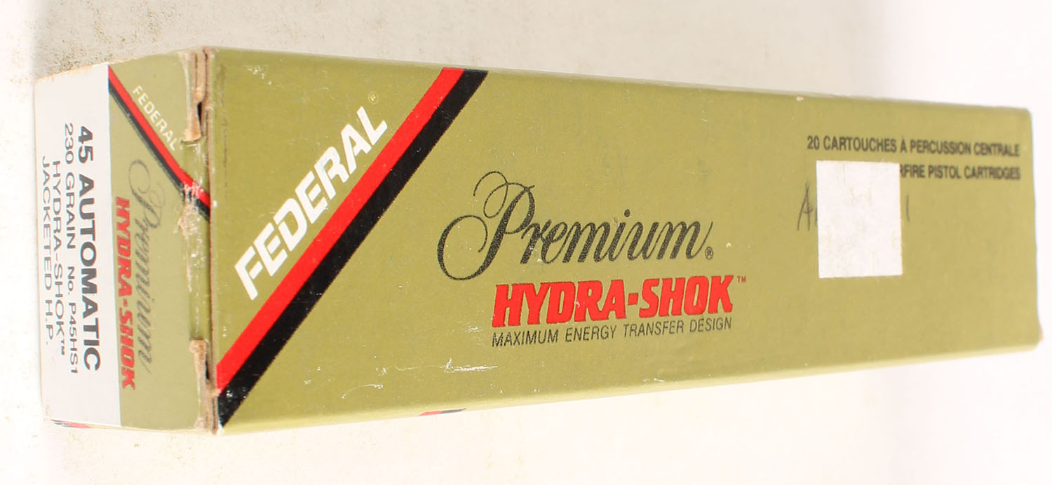 Federal, Premium Hydra-Shok, 45 Auto, 230 Gr. Jacketed H.P., Full, 1pc., multi-colored box, box is solid with great color, end flaps are solid, ammo is excellent. Grade: Excellent - Value: 16 to 40