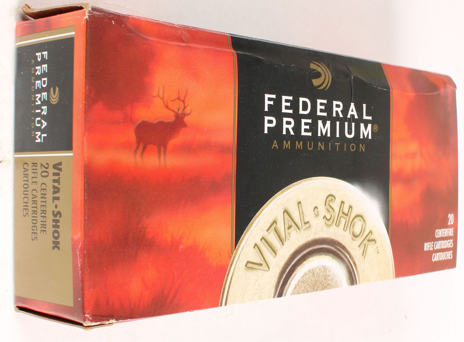 Federal, Vital-Shok, 300 H&H Mag, 180 Grain Nosler Partition, Full, 1pc. Multi-colored box, box is solid with great color, has a seam split, end flaps are solid, ammo is excellent. Grade: Excellent - Value: 20 to 80