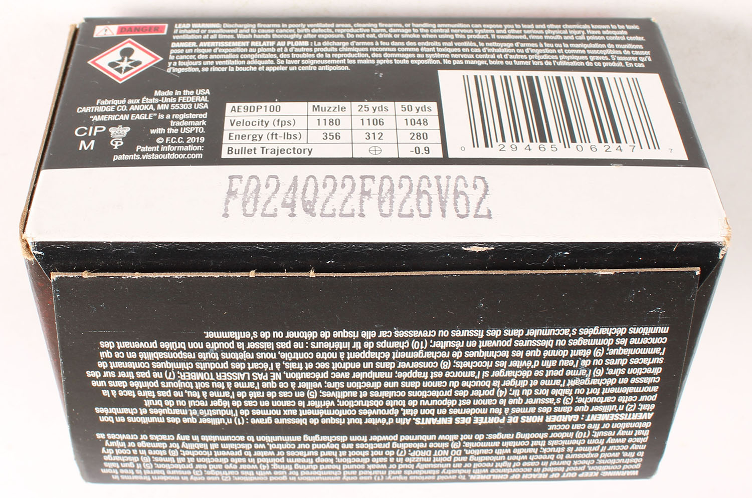 Federal, American Eagle, 9mm Luger, 115 Grain FMJ, FULL & SEALED, 1pc., multi-colored box, box is solid with great color, end flaps are solid. Grade: Excellent ++ - Value: 10 to 50