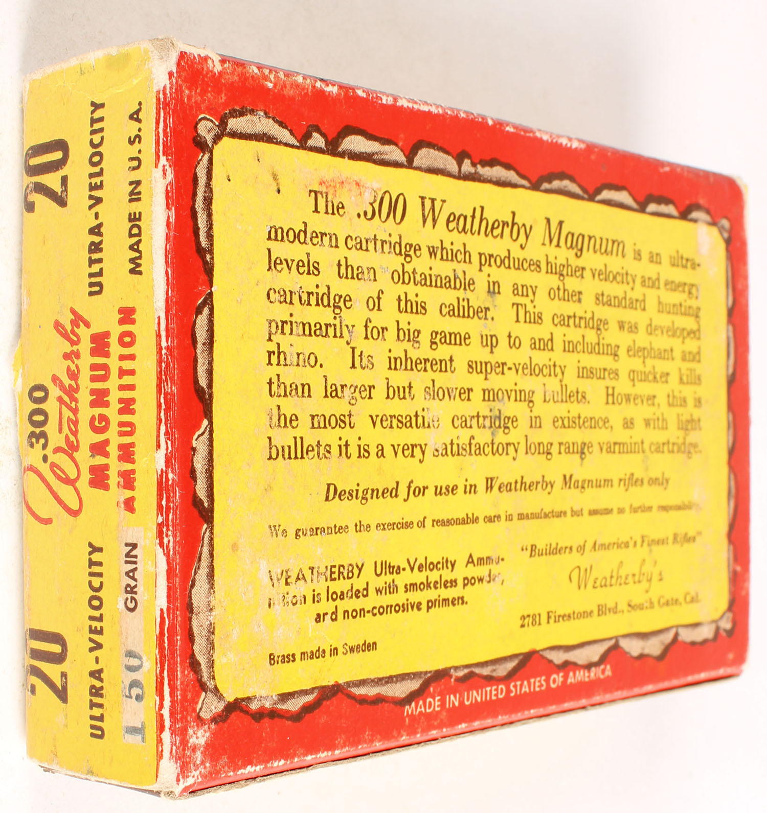 Weatherby, 300 W.M., 150 Grain Ultra-Velocity, Full, 1pc. multi-colored box, box has minor age soiling & corner wear, Ammo is very good. Grade: Very Good ++ - Value: 20 to 80