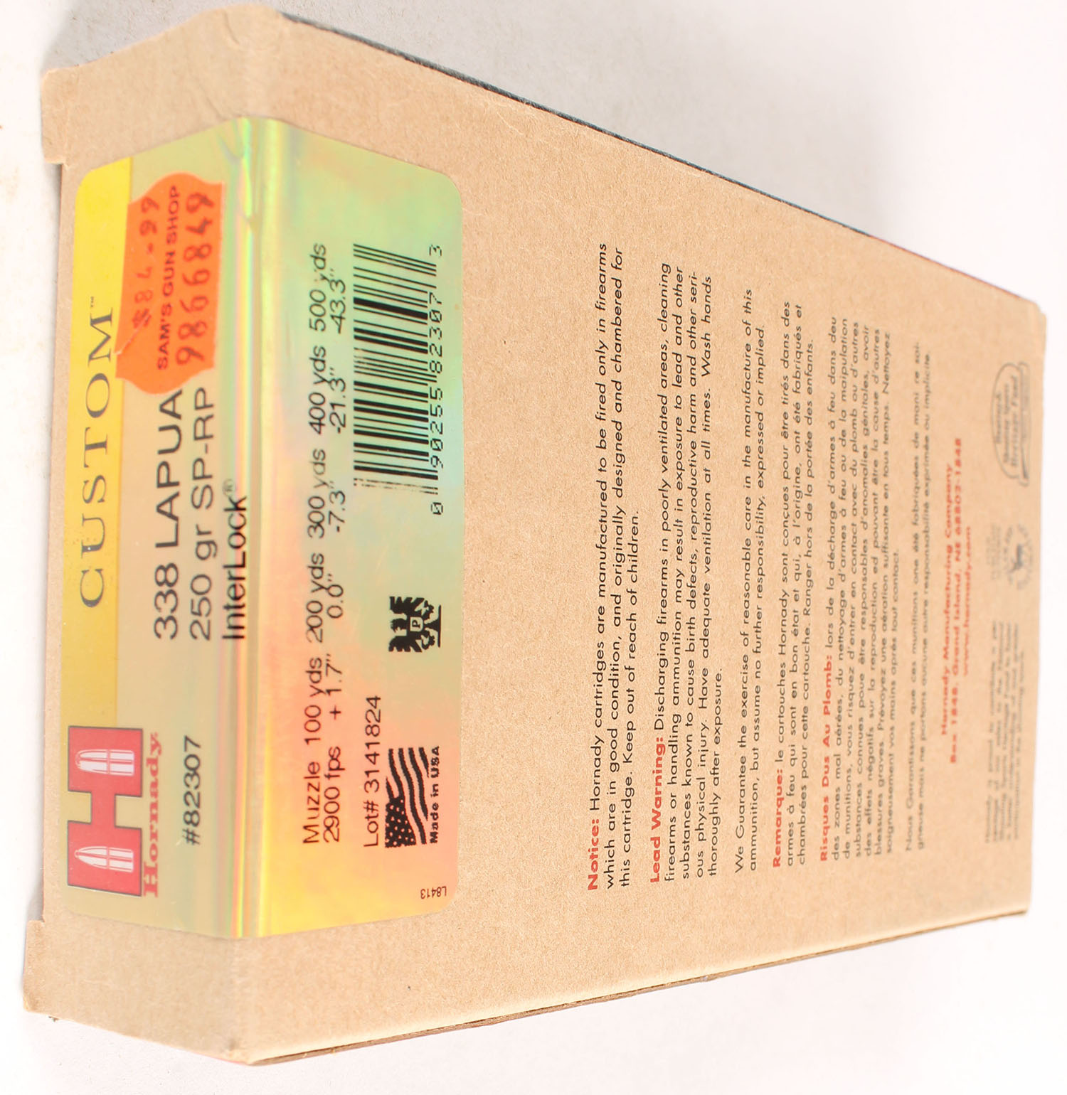 Hornady, Custom, .338 Lapua, 250 Grain SP-RP interlock, Full, 1pc. multi-colored box, box is solid with excellent color, Ammo is excellent. Grade: Excellent + - Value: 30 to 90