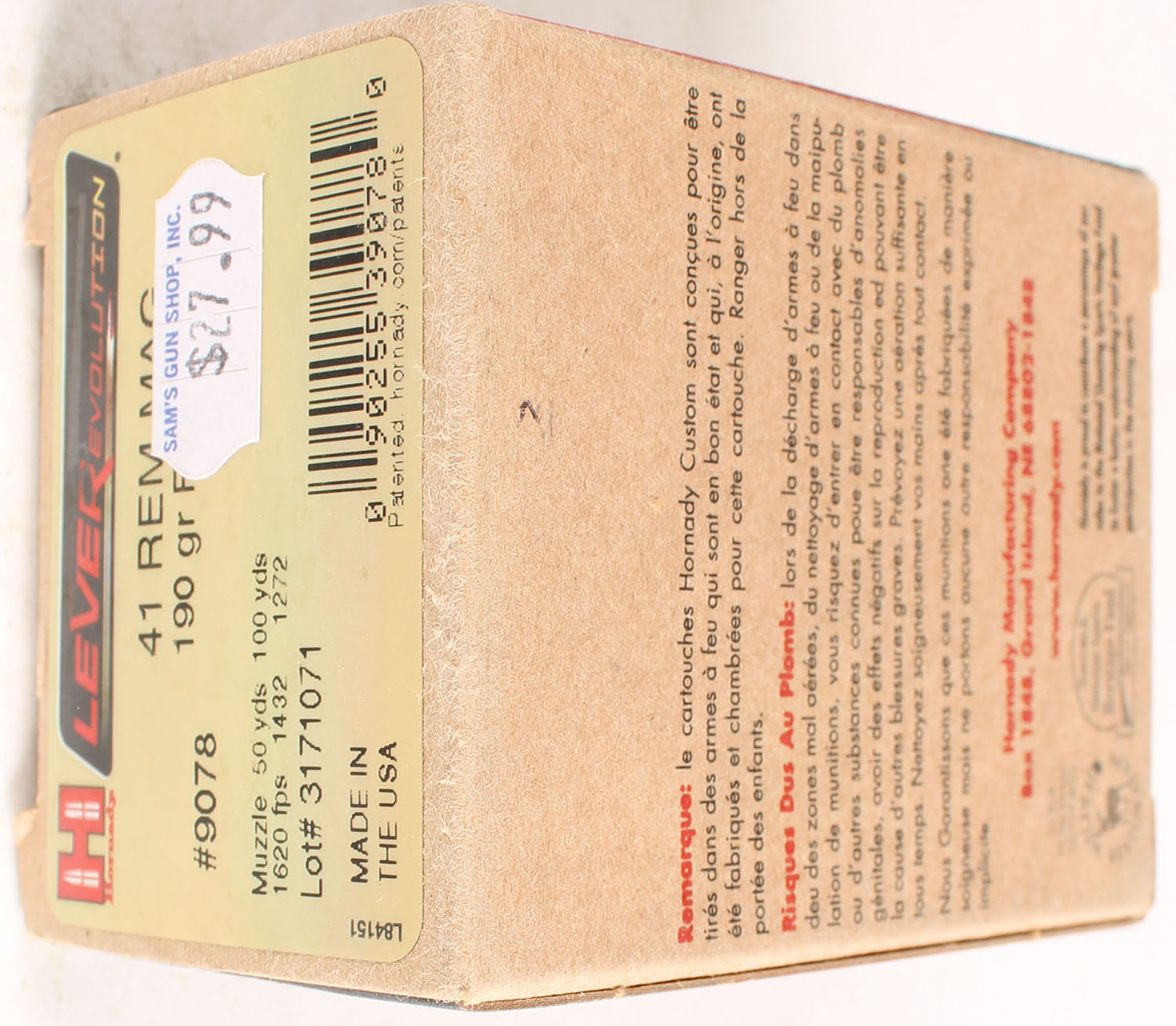 Hornady, Lever Evolution, 41 Rem Mag, 190 Grain FTX, Full, 1pc., multi-colored box, box has great color, ammo is minty. Grade: Excellent ++ - Value: 10 to 50