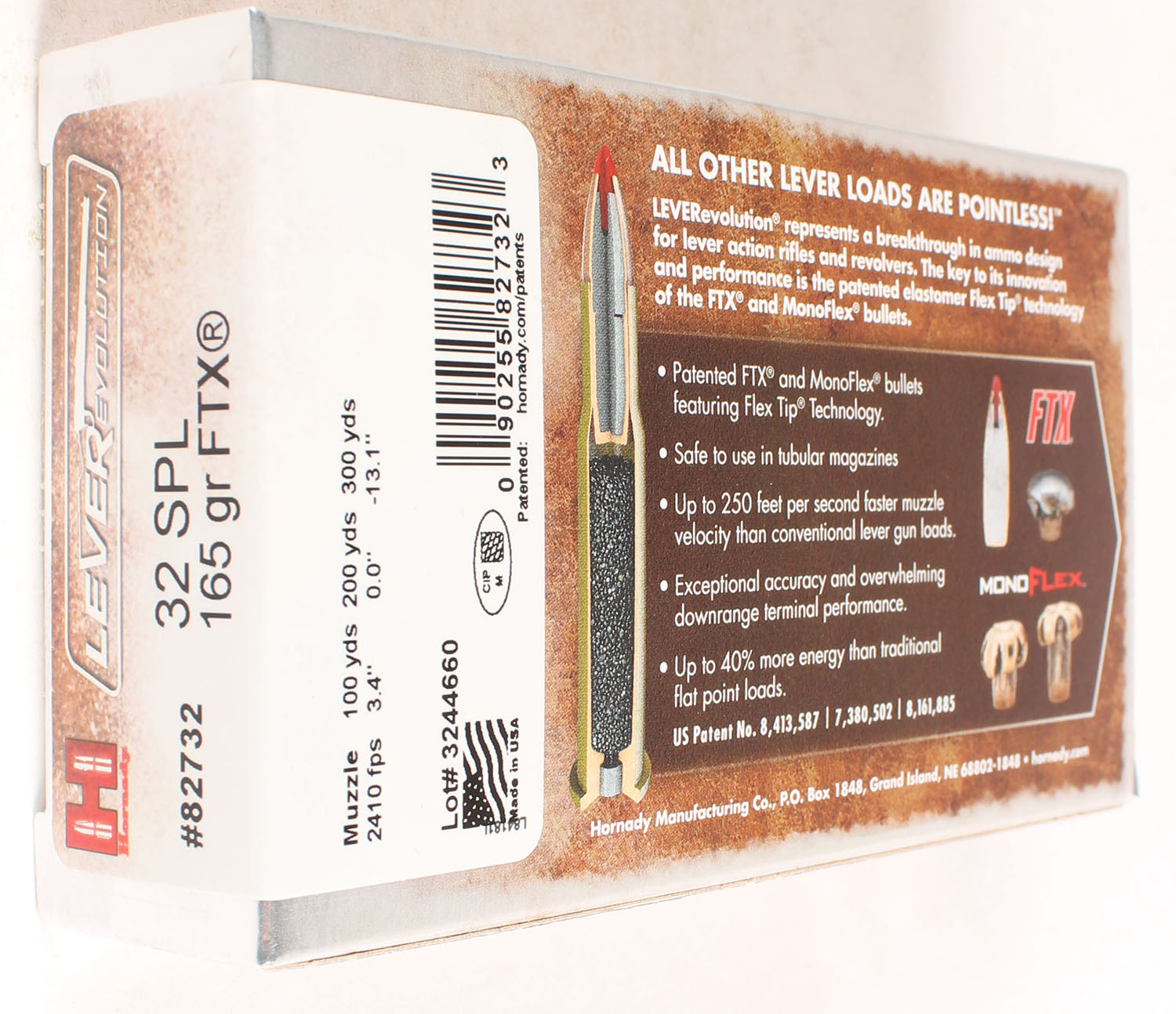 Hornady, LeverEvolution, .32 SPL., 165 Grain FTX, Full, 1pc. multi-colored box, box is solid with excellent color, Ammo is excellent. Grade: Excellent ++ - Value: 20 to 60