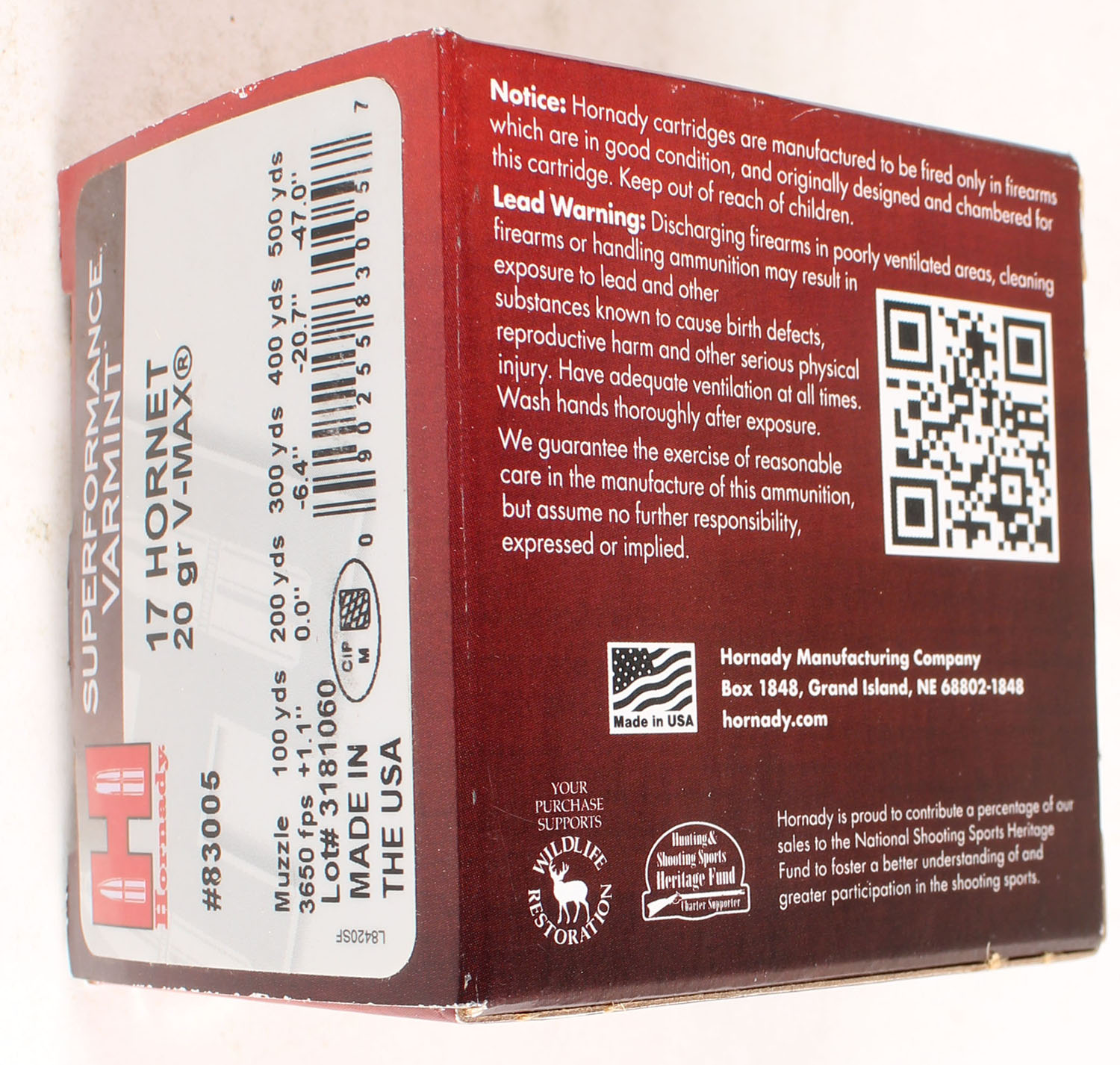 | Hornady, Superformance, .17 Hornet, 20 Grain V-Max, Partial 23rd...
