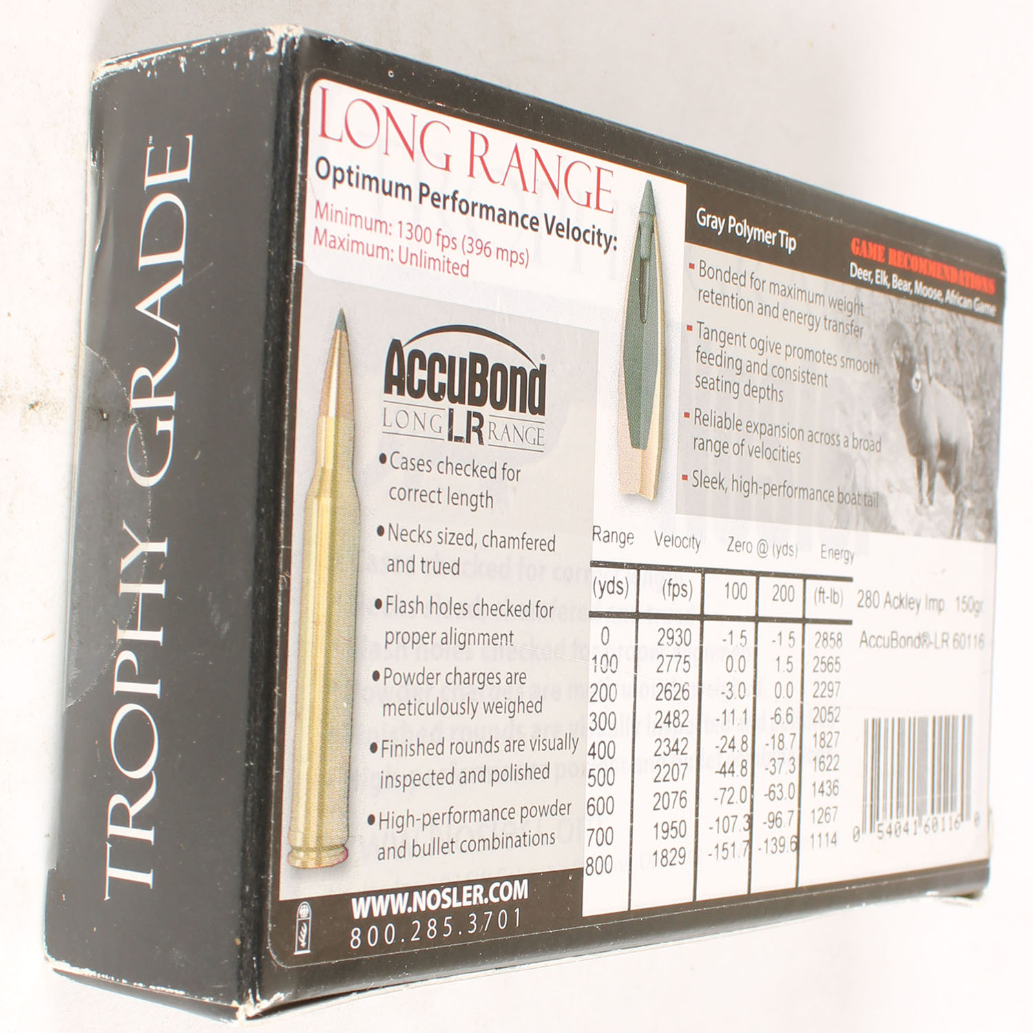 Nosler, Trophy Grade, 280 Ackley, 150 Grain ABLR, Full, 1pc. multi-colored box, box is solid, with excellent color, Ammo is excellent. Grade: Excellent + - Value: 20 to 80