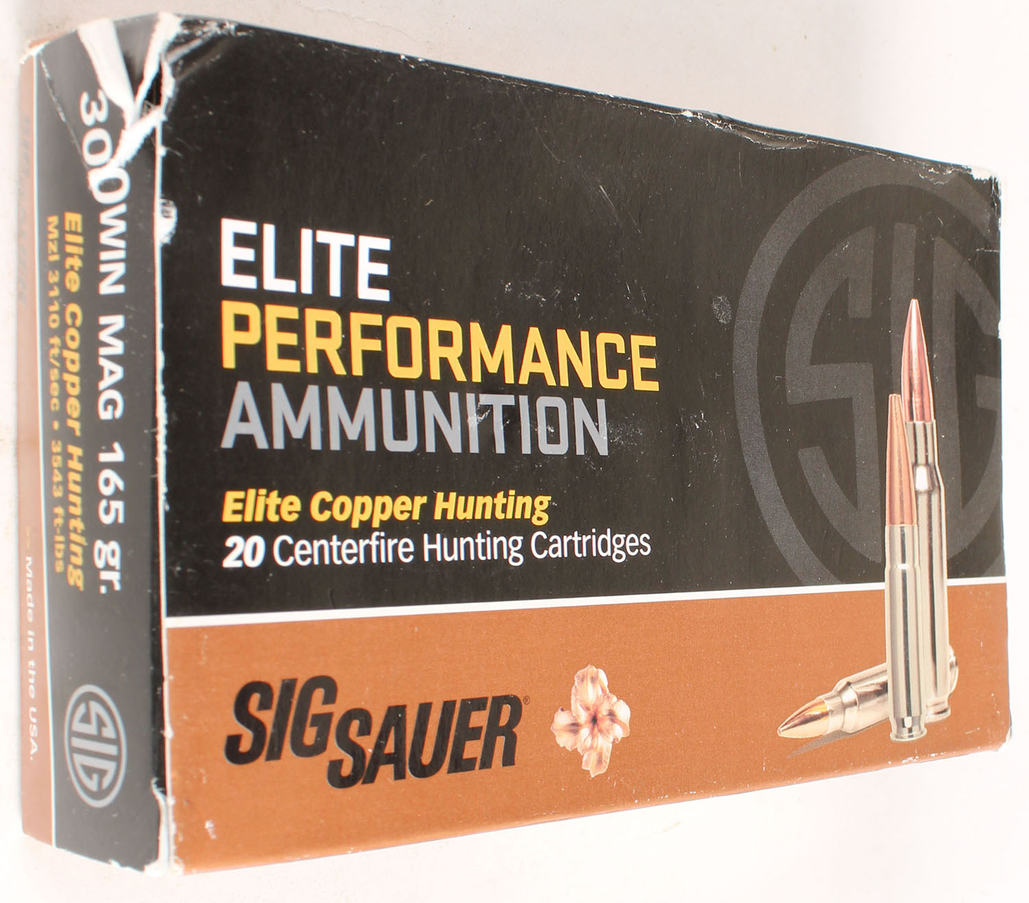 Sig Sauer, Elite Performance, .300 WIN. Mag., 165 Gr. Elite Copper Hunting, Full, 1pc. multi-colored box, box has corner wear, Ammo is minty. Grade: Very Good ++ - Value: 10 to 50