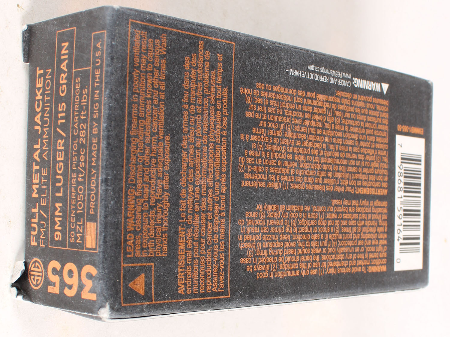 Sig Sauer, 365, Elite/FMJ, 9mm Luger, 115 Grain, Full, 1pc. multi-colored box, box is solid, Ammo is excellent. Grade: Excellent + - Value: 10 to 50