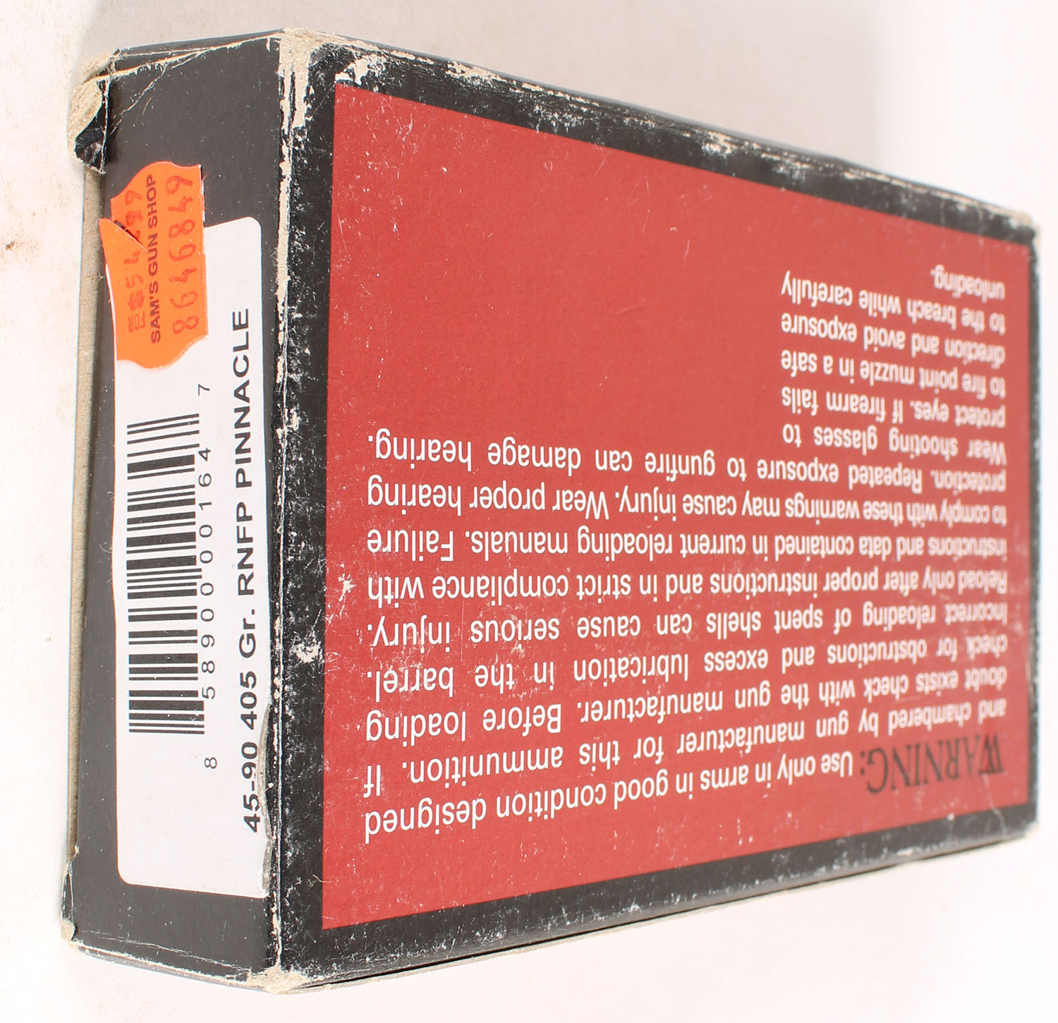 Goex Pinnacle 45-90 405 Gr. RNFP Pinnacle, Full, 1pc. multi-colored box, box has light scuffing & corner wear, Ammo is excellent. Grade: Very Good ++ - Value: 20 to 80