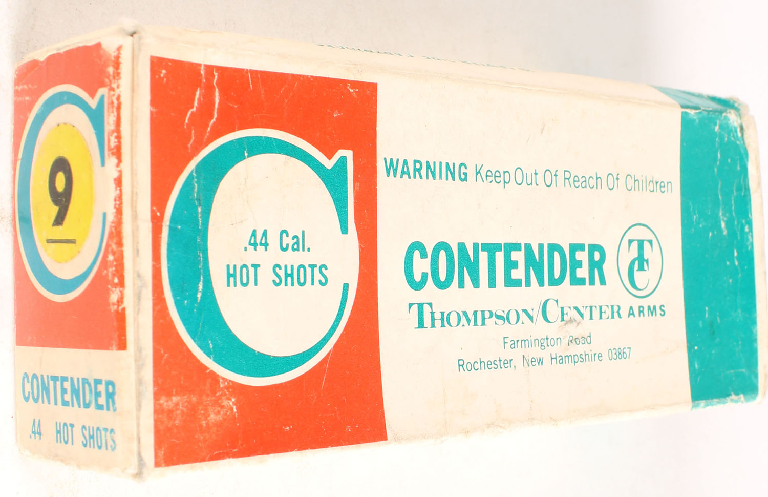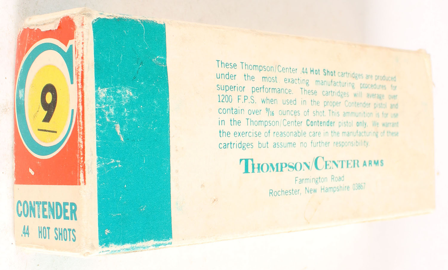 Thompson Center Arms, Contender, .44 Cal. Magnum Hot shots, 1pc, Ful, multi-colored box, box has some age soiling with scuffing, ammo is very good. Grade: Very Good - Value: 10 to 40