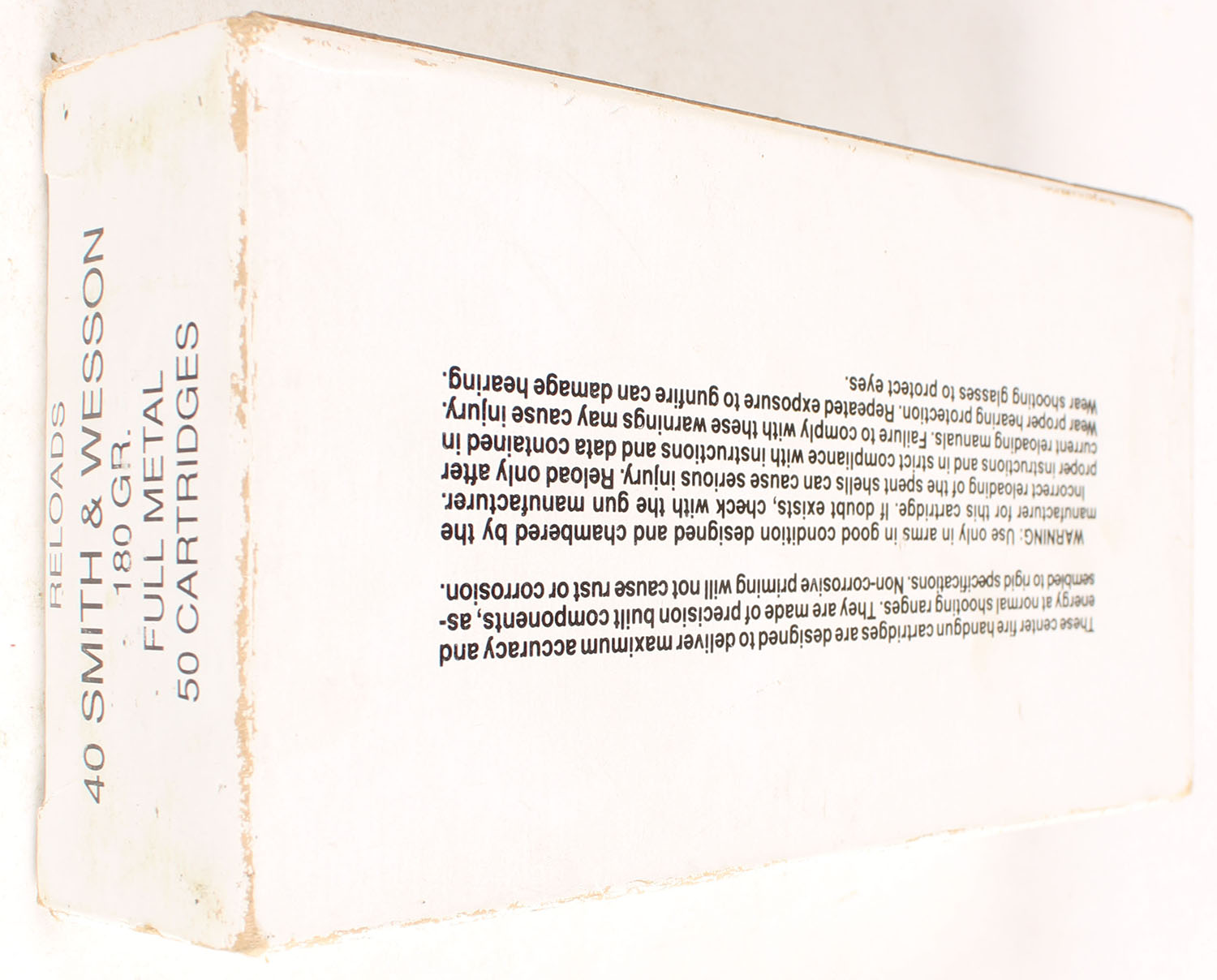 Unknown Mfg. .40 Smith & Wesson, 180 Gr. Full Metal, Full, 1pc, White box with black print, box is solid, ammo is very good. Grade: Very Good + - Value: 10 to 50